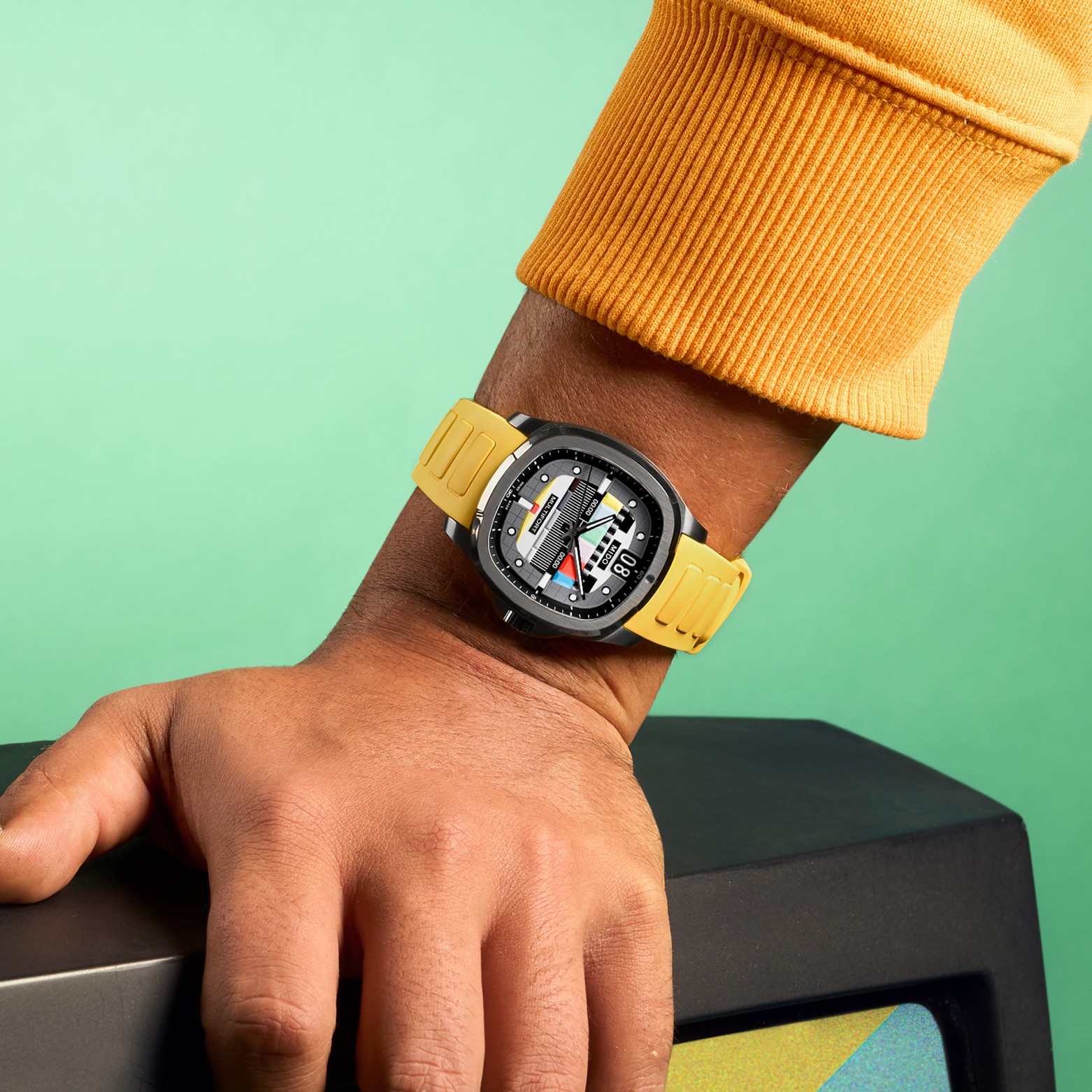 這枚腕錶以滿格活力喚醒舊時的電視記憶,大膽玩色。錶盤以當時獨有的「像素雜訊」為靈感,忠實重現紅、藍、綠、黃四道訊號彩條,貫穿整個視覺焦點,那是在播放停格時才會出現的經典畫面,也是無數人共同的記憶。這熟悉的影像象徵著未完的故事與全新的開場,並意味著下一幕即將登場。指針在這些彩條上一圈圈迴轉及交疊,讓停留的畫面變成熱鬧播映的節目,灰色金屬背景化作舞台布幕,襯托出色彩的張力與層次,喚醒人們對螢幕光影的期待。前衛活潑的配色讓造型更具動感與節奏,在復古與未來之間展現鮮明個性,成為無法忽視的新世代潮流標誌。