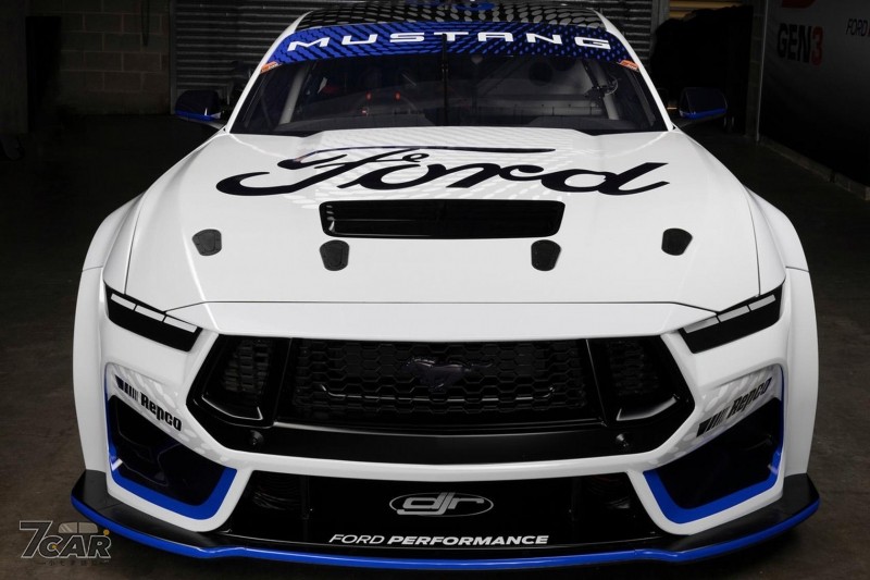 外觀方面,Mustang GT Gen3 Supercar 基於 Mustang Dark Horse進行升級,除了換上白色塗裝搭配藍色彩繪之外,亦搭載符合賽制規範的空氣力學套件,包括前擾流板、側裙以及後擾流板等部位都與市售有所不同,同時還配備鍛造輪圈以及熱熔輪胎來對應競技需求。