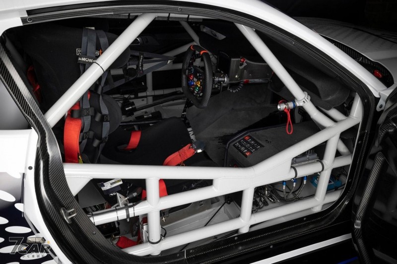車內部分自然也是迎合 FIA 規範移除了所有的原廠鋪陳,換上專屬的輕量化套件,同時加裝了防滾籠、快拆方向盤、桶型賽車座椅以及四點式安全帶,並且藉由大量的碳纖維材質來進一步減輕車身重量。
