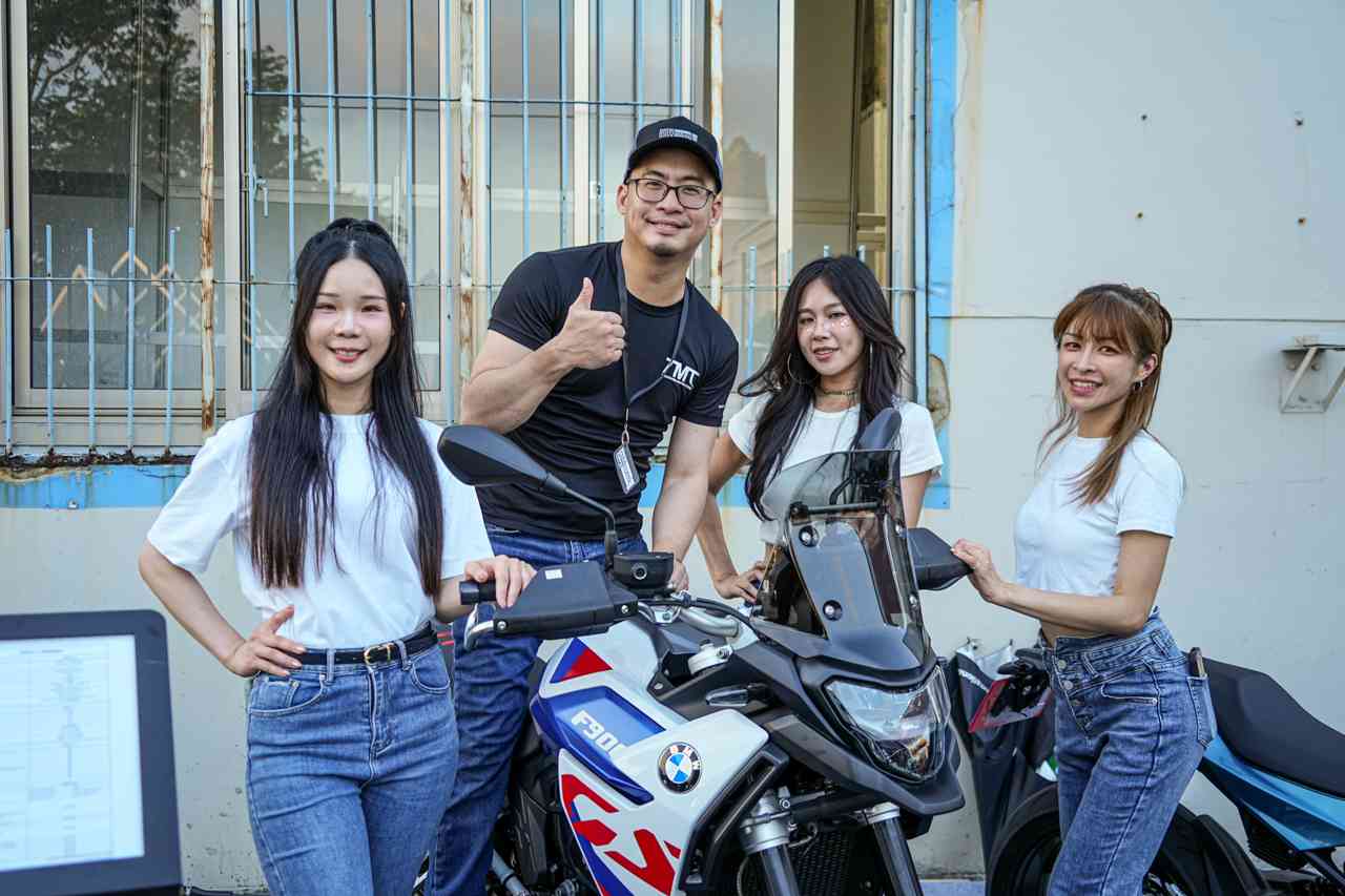 BMW Motorrad 國際教官Johnny與車迷在展示的 F 900 GS 車款旁親切合影互動。