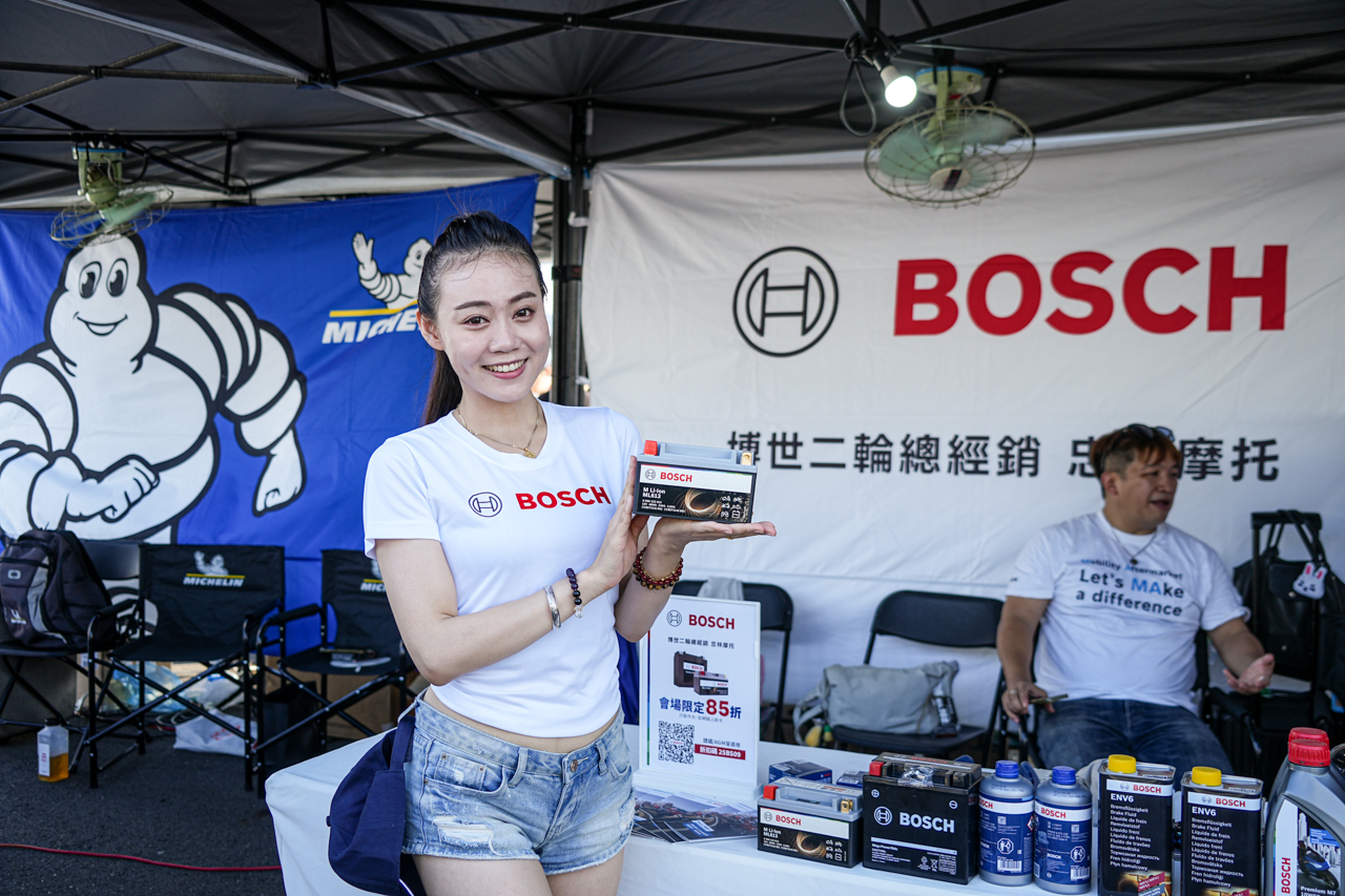 Bosch 展示了其摩托車電池產品,工作人員熱情地向車友介紹產品特色及優惠方案。
