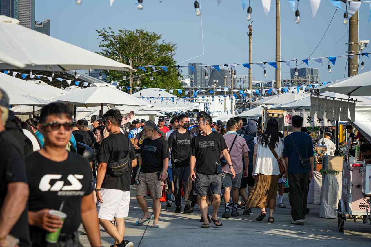 活動現場設置了眾多美食與文創攤位,市集走道上人潮洶湧,車友們在兩旁的白色遮陽傘下穿梭,享受港都的假日氣氛。