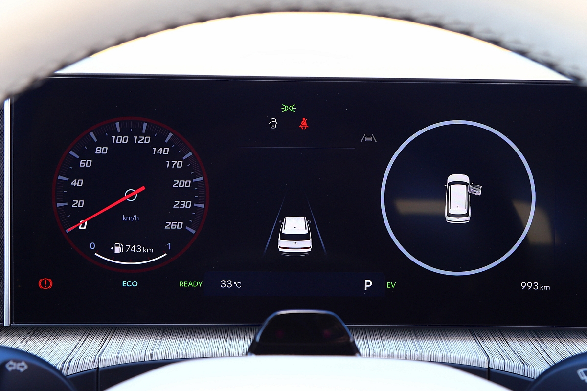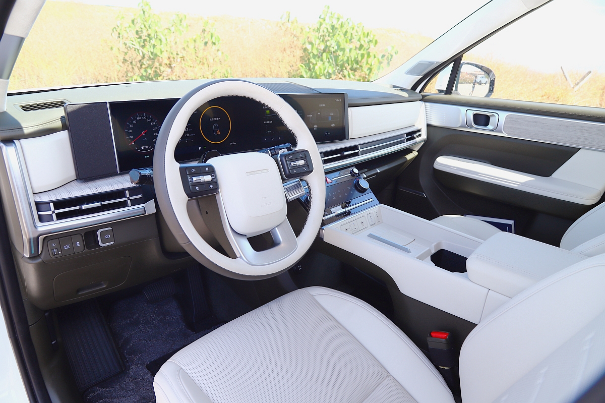 身為頂級旗艦車型的Hyundai Santa Fe Calligraphy,科技配備如12.3吋TFT-LCD全曲面數位儀錶、Easy-Adjust電動調整方向盤、第二排座椅加熱功能、H-Shaped 64色可調式氣氛燈、ECM電子防眩後視鏡,甚至第二排側邊遮陽簾等都是標準配備。