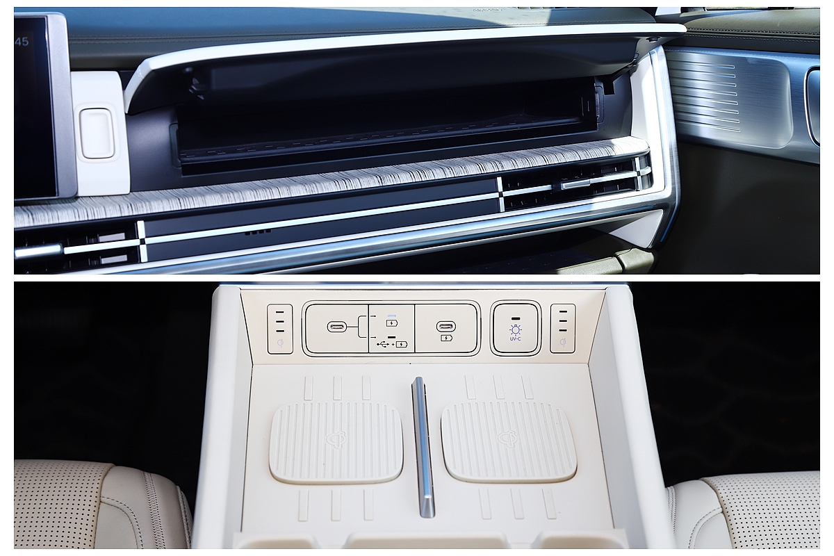 Hyundai Santa Fe Calligraphy內裝科技專屬配備方面,還有Easy-Charge雙Qi無線充電座、Easy-Clean副駕上層置物箱紫外線殺菌功能、Easy-Hang第二排衣物吊掛椅背以及Relaxion零重力座椅。其中Relaxion零重力座椅只需透過一鍵就能展開,結合小腿腳靠提供極致的休憩角度。