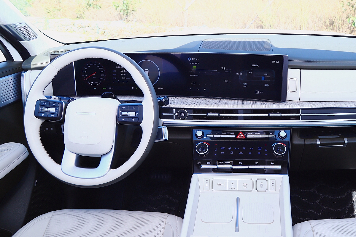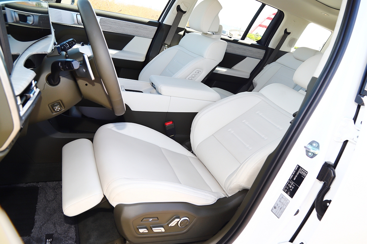 南陽出借的Hyundai Santa Fe Calligraphy車艙為米白色內裝,另外還有墨黑、皮革棕兩種可選。只是米白色內裝特別的是,除擁有Nappa頂級真皮座椅、類木紋飾板之外,上儀表臺以及大面積內車板等細節,則採用墨綠色的獨特搭配設計。