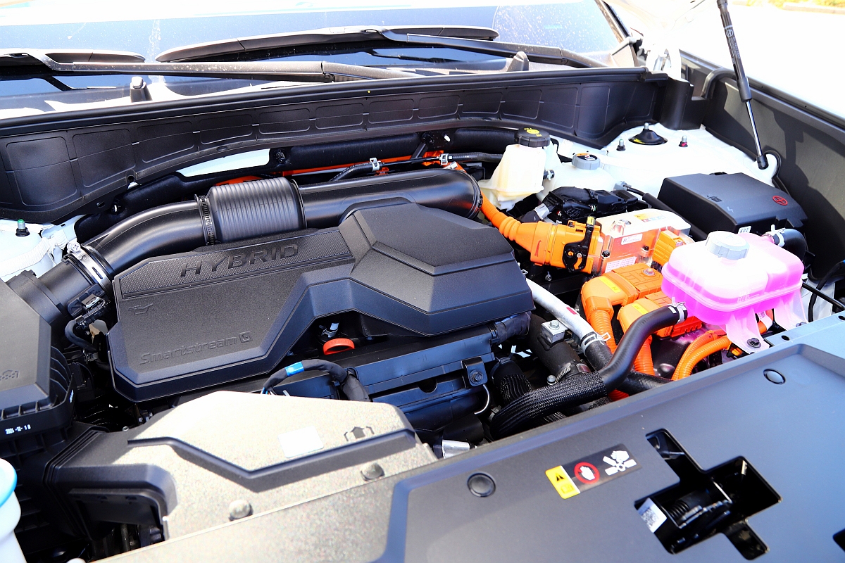 1.6L Turbo汽油引擎結合電動馬達,能提供Hyundai Santa Fe Calligraphy馬力218ps、扭力37.4kgm的綜效動力輸出。特別的是,電動馬達能夠在不啟動引擎狀態下獨自運作,只要在電力充足之下,緩慢移動車輛或倒車都能採用純電來驅動。