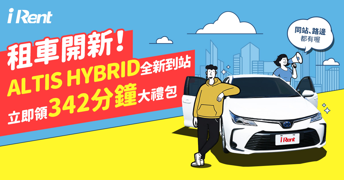 為慶祝COROLLA ALTIS HYBRID正式上線,iRent推出限時回饋活動,即日起至11/30輸入兌換碼「租車開新」,即可獲得總計 342分鐘折抵券組合,包含「iRent汽車30分鐘折抵券2張」、「ALTIS HYBRID限定使用30分鐘折抵券1張」、「汽車滿6小時折2小時折抵券2張」、「機車前6分鐘折抵券2張」。