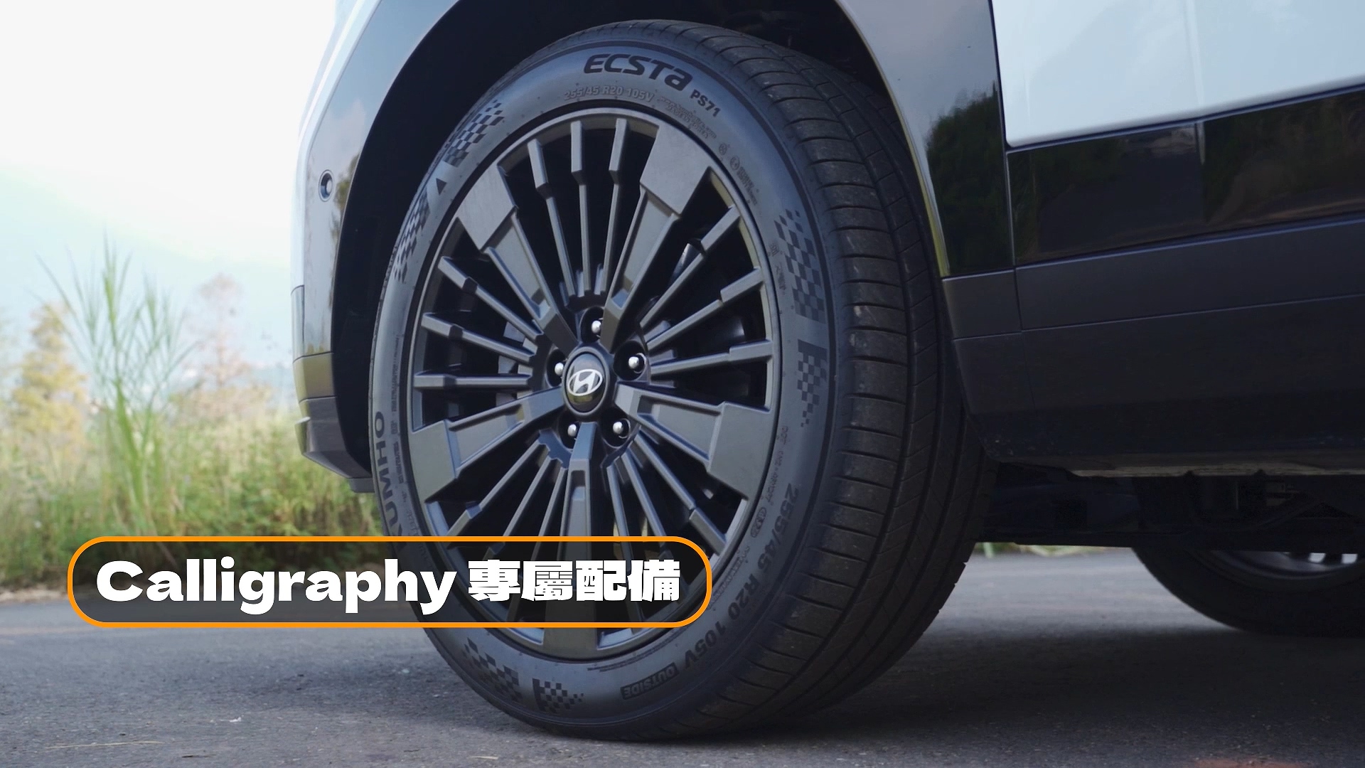 Calligraphy車型在外觀設計上採用專屬墨黑星綴水箱護罩與20吋墨黑鋁圈,搭配黑化廠徽與車側防刮飾板,強化整體運動化與尊榮感。此外,該車配備H-shaped LED日行燈及尾燈設計,提升辨識度與視覺層次感。