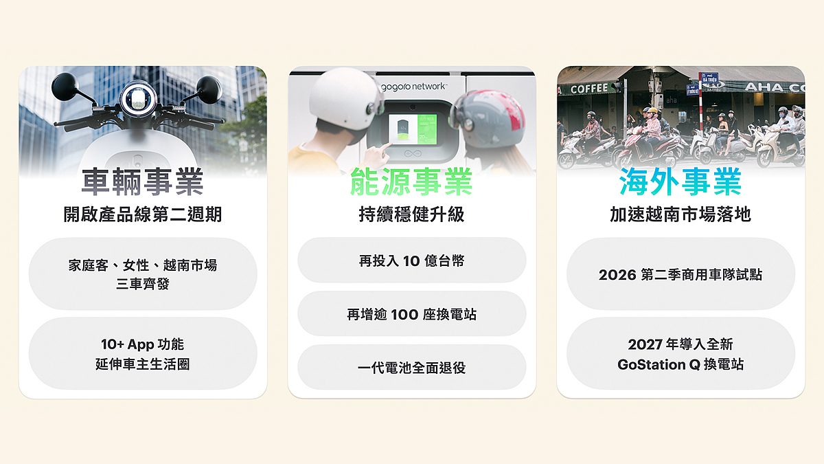 Gogoro 宣布 2026 年全新產品佈局,從車輛事業、能源事業及海外事業三大面向著手,開拓成長新曲線。以車主為核心,今年 Gogoro 將為女性與家庭客推出兩款新車、為越南市場打造專屬車款;更宣布見證台灣電動機車產業發展的第一代電池於今年全面退役,並加碼投資新台幣 10 億元發展能源網路,以及發表全新輕量化換電站產品「GoStation Q」,加速越南市場落地。