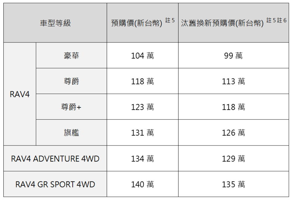 由於全新第六代Toyota RAV4在已經公布的美國、歐洲等市場價格都是上揚趨勢,這也讓不少人好奇台灣市場定價如何?就在剛剛,已經傳出新Toyota RAV4的接單價訊息,台灣將會導入三種外觀風格、單一動力、共六車型的銷售陣容。