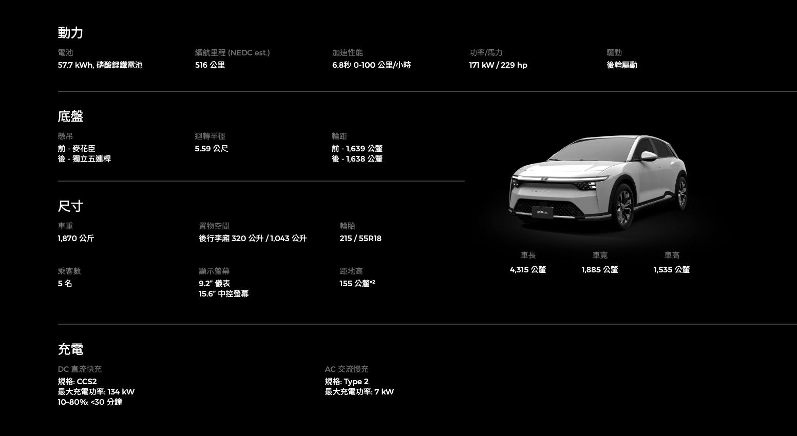 動力部分,三個車型統一搭載57.7kWh容量的磷酸鋰鐵電池,最大充電功率為134kW,10%~80%的充電時間為30分鐘,入門與中階採單馬達後驅配置,馬力有229匹,扭力來到35.7kgm,NEDC續航力有516km。充電規格為CCS2。