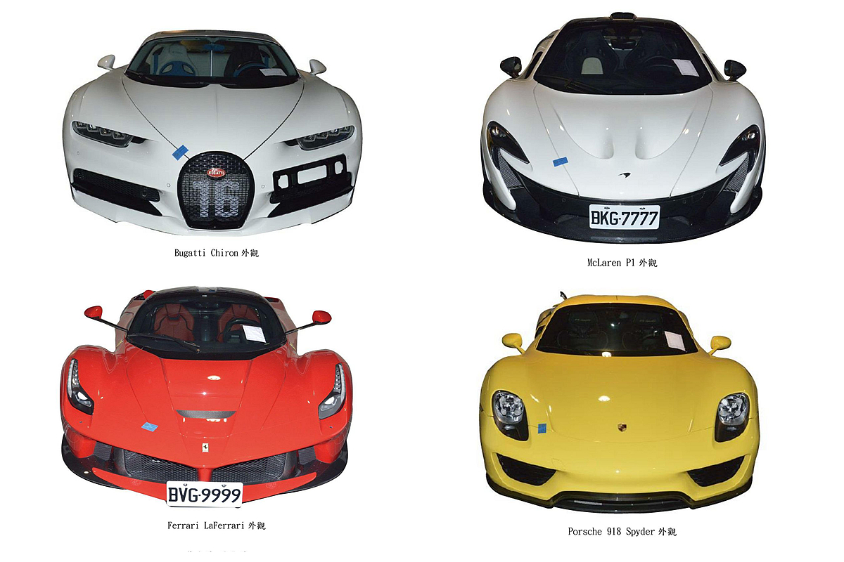 拍賣33輛名車之陣容堪稱國內執行機關史上最豪華,其中最受矚目的焦點莫過於車界譽為「四大神獸」的頂級超跑,包括法國頂級手工跑車BUGATTI Chiron Sport 、法拉利馬王FERRARI LaFerrari、麥拉倫傳奇Mclaren P1及機能美學典範的保時捷PORSCHE 918 Spyder。