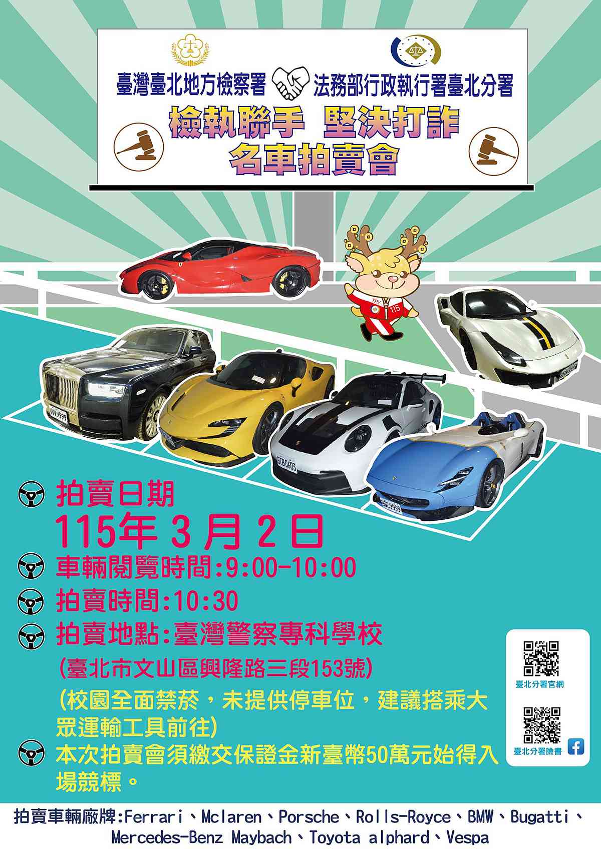 法務部行政執行署臺北分署發出新聞稿表示,法務部行政執行署臺北分署受臺灣臺北地方檢察署囑託,將於115年3月2日(星期一)上午10時30分,假臺灣警察專科學校舉辦盛大的「聯合打詐宣示儀式暨名車拍賣會」。