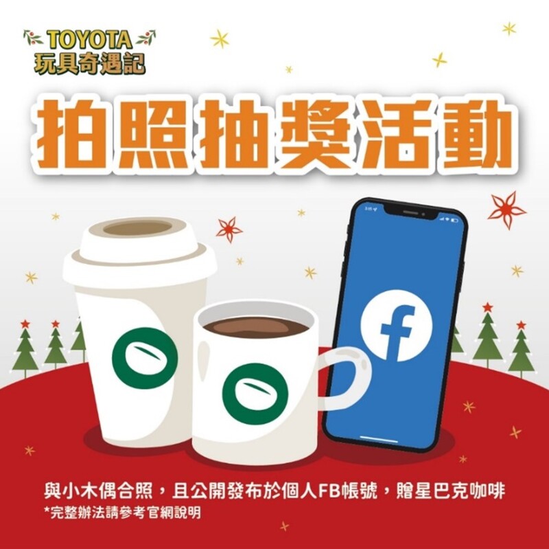 TOYOTA玩具奇遇記不只有小木偶聖誕樹,還有星巴克咖啡天天贈活動,2022年12月16日~2023年1月1日,民眾至活動現場與小木偶合照,並於FB個人帳號公開發布,發布時hashtag「#TOYOTA玩具奇遇記好拍好玩還贈星巴克咖啡」,就有機會享用星巴克咖啡,總共1,050份星巴克電子飲料券天天贈,等您來享用!完整辦法請參考TOYOTA官網https://ourl.tw/7jSzLv。