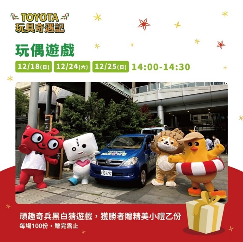 12月18、24、25日下午兩點頑趣奇兵人偶驚喜現身,與現場民眾互動玩遊戲,獲勝者現場贈送精美小禮乙份,歡迎民眾踴躍前往參與,週末快閃活動遇雨取消,完整資訊請參考https://ourl.tw/XBGlyg。
