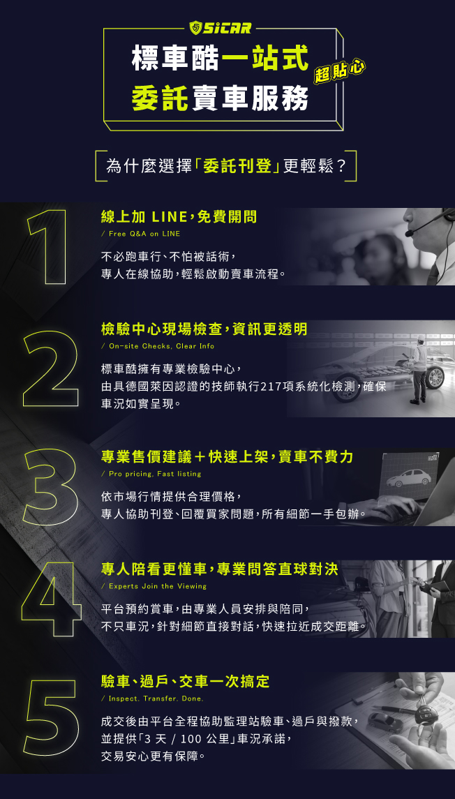 不只有檢驗、選車、看車,標車酷更提供第三方交易保障,從簽約、過戶到金流,全程由平台把關,不會再有收訂後換車或被告知已經賣出的拙劣手法,甚至對於車況保障還提供三天100公里保固,讓您買得安心、開得放心。