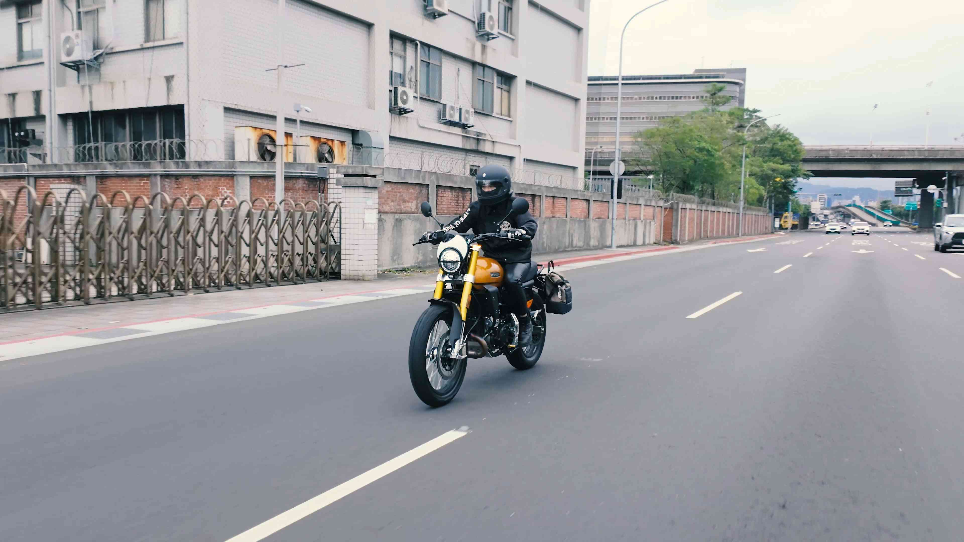 上車的第一印象是「出乎意料的緊湊」。Caballero 500 雖是標準 Scrambler 比例,整車乾重僅 150 公斤,座高 820mm,騎上車後車身的輕盈感立即傳遞到手把與膝蓋的夾持之間。寬把設計讓轉向施力點提高,但實際過彎時並不費力,車身似乎主動配合騎士的重心移動,提供一種「有人在幫你引導入彎」的協作感。