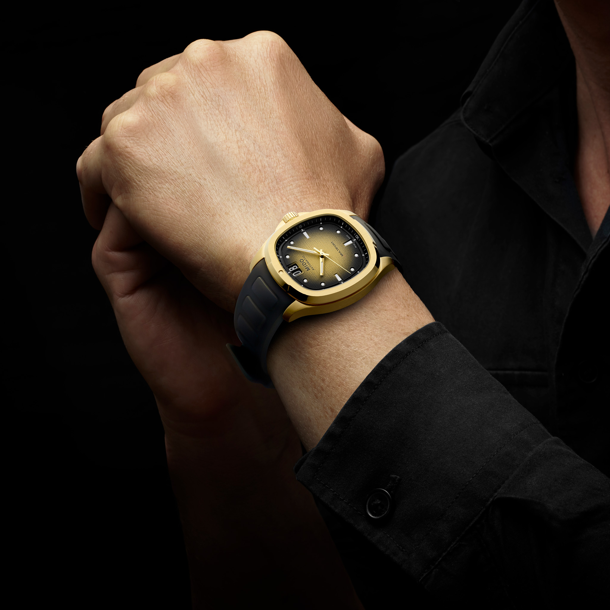 相較於 TV 系列的高調輪廓,Multifort 8 Two Crowns 以結構感鮮明的設計語言,呈現另一種同樣吸睛的金色風格。玫瑰金色 PVD 鍍層為錶殼帶來溫潤而深邃的金屬光澤,搭配標誌性的八角形錶圈與俐落切面線條,使整體外型更顯立體有力,在節慶場合中展現沉穩卻不容忽視的存在感。腕錶最大特色在於雙錶冠設計,位於 2 點鐘位置的錶冠用以操作內部旋轉錶圈,4 點鐘位置的錶冠則負責時間與日期調校,清楚區分功能操作,使佩戴與使用更為直覺。錶盤配置立體時標與指針,並覆以 Super-LumiNova® 夜光塗層,在不同光線條件下皆能維持良好可讀性,兼顧造型層次與實用需求。