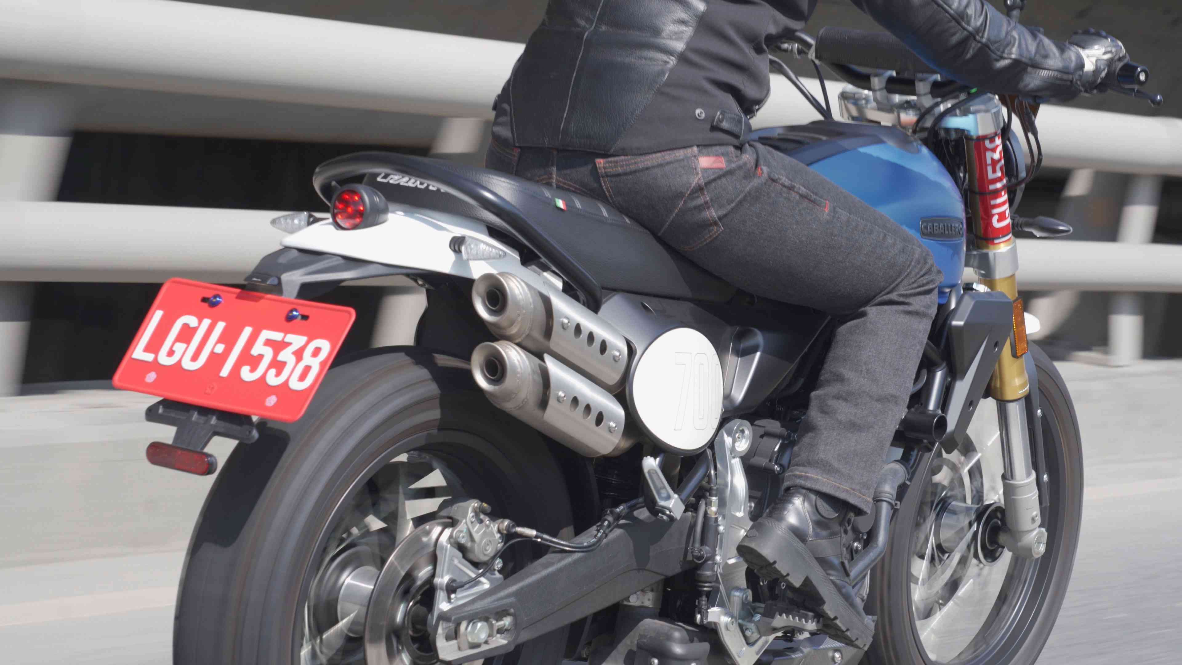 Scrambler 車型的一大特色是能應付多種路況。Caballero 700 採用 45mm 倒立式前叉與中置單槍後避震,懸吊行程約為 150mm,在公路操控與輕度越野之間取得不錯的平衡。實際騎乘時,車架剛性帶來相當穩定的操控感,在山路彎道中能夠維持良好的循跡與回饋,同時也保有 Scrambler 車型應有的路感。