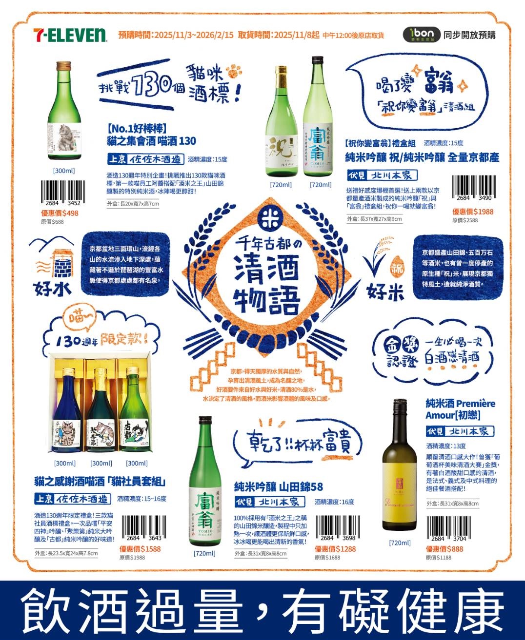 千年風華醉心京都!京都擁有水質柔和甘甜的天然湧泉,搭配肥沃田地種植的高品質酒米,釀造出風味細緻、口感圓潤的清酒,是日本三大清酒產地之一。節慶時節來到,還在為挑選節慶禮物而煩惱的各位,聖誕節交換禮物與年節禮盒就來7-ELEVEN i預購京都清酒吧!貓派必收兩款來自洛中的佐佐木酒造,推出成立130年紀念組合「貓之感謝酒喵酒貓社員套組」把對貓社員的感謝與的喜悅完美融入其中,還有一款要挑戰推出130款貓咪酒標的「No.1好棒棒 貓之集會酒 喵酒130」,採用100%山田錦釀造,口感清爽輕盈適合初學者飲用!而自古就以水陸交通樞紐而蓬勃發展的伏見「北川本家」,首推讓你送出圓滿心意的「祝你變富翁禮盒組」、喝了就變富翁的「純米吟釀 山田錦58」及讓喜愛白酒的人也被驚艷的「純米酒Premiere Amour初戀」酸甜口感彷彿般令人悸動,祝福之意就用送禮來表達!即日起至2026年2月15日於全台7-ELEVEN開始預購。