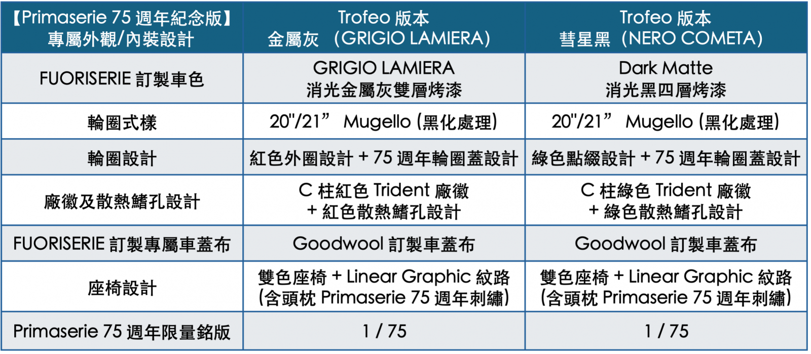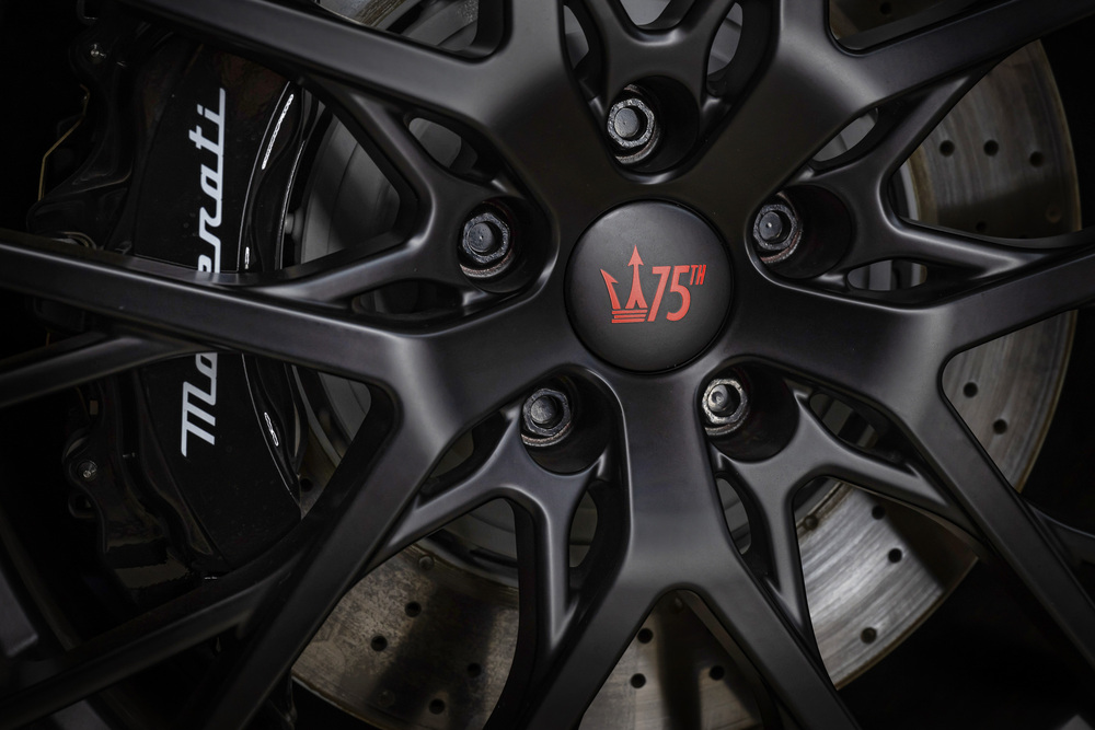 限量版外觀配備前 20 吋、後 21 吋的 Mugello 黑化輪圈,將引人注目的 75 週年標誌置於輪圈中央,而車室內的 4 座頭枕則以 75 週年標誌的專屬刺繡進行點綴,搭配雙色 Linear Graphic 紋路的座椅內裝,精湛工藝之下的細緻鋪陳,為義式奢華做出了最佳詮釋。