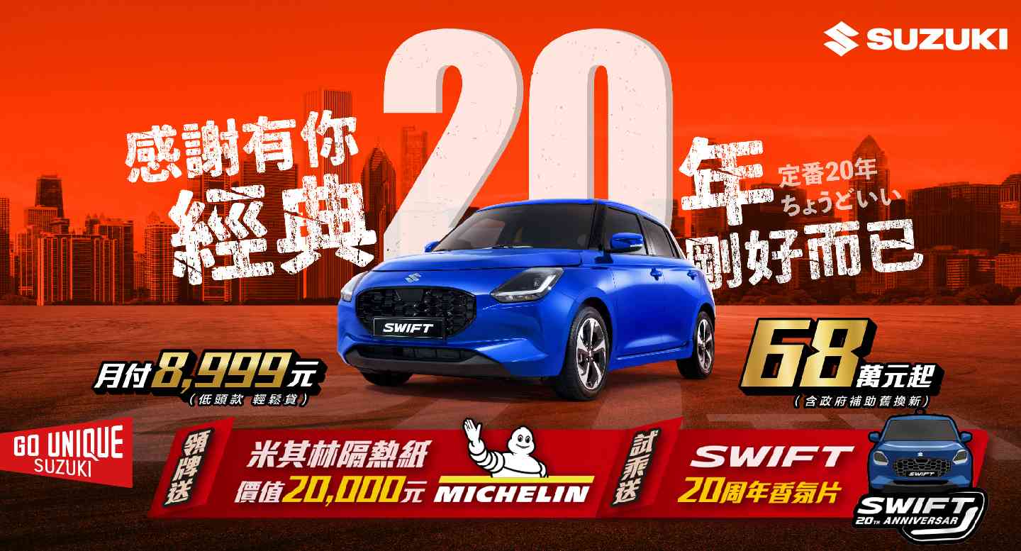 為了感謝台灣消費者20年來的支持與喜愛,TAIWAN SUZUKI特別推出「20周年專案」,讓您以輕鬆月付8,999元的超值優惠,輕鬆入主暢銷神車SWIFT,無壓力享受高效節能的駕馭樂趣。此外,現在來店試乘SWIFT,即可獲得SWIFT 20周年獨家香氛片,為您的旅程增添獨特品味,感受專屬於SWIFT的非凡魅力!