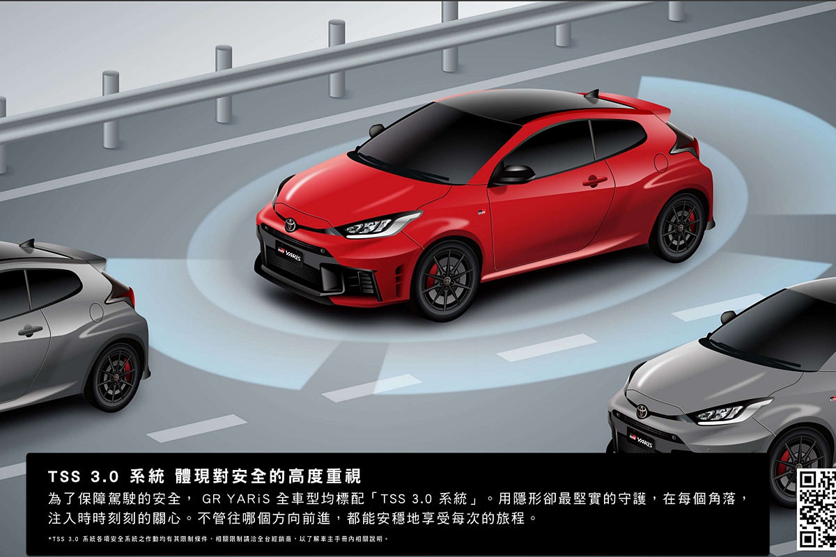 台灣銷售的Toyota GR Yaris 8AT自排或6 iMT手排車型,全數標配TSS 3.0智動駕駛輔助系統,包括ACC主動式車距維持定速、PCS預警式防護、LTA車道循跡輔助、RSA限速辨識輔助等,其中8AT自排車型更享有ACC全速域輔助功能。