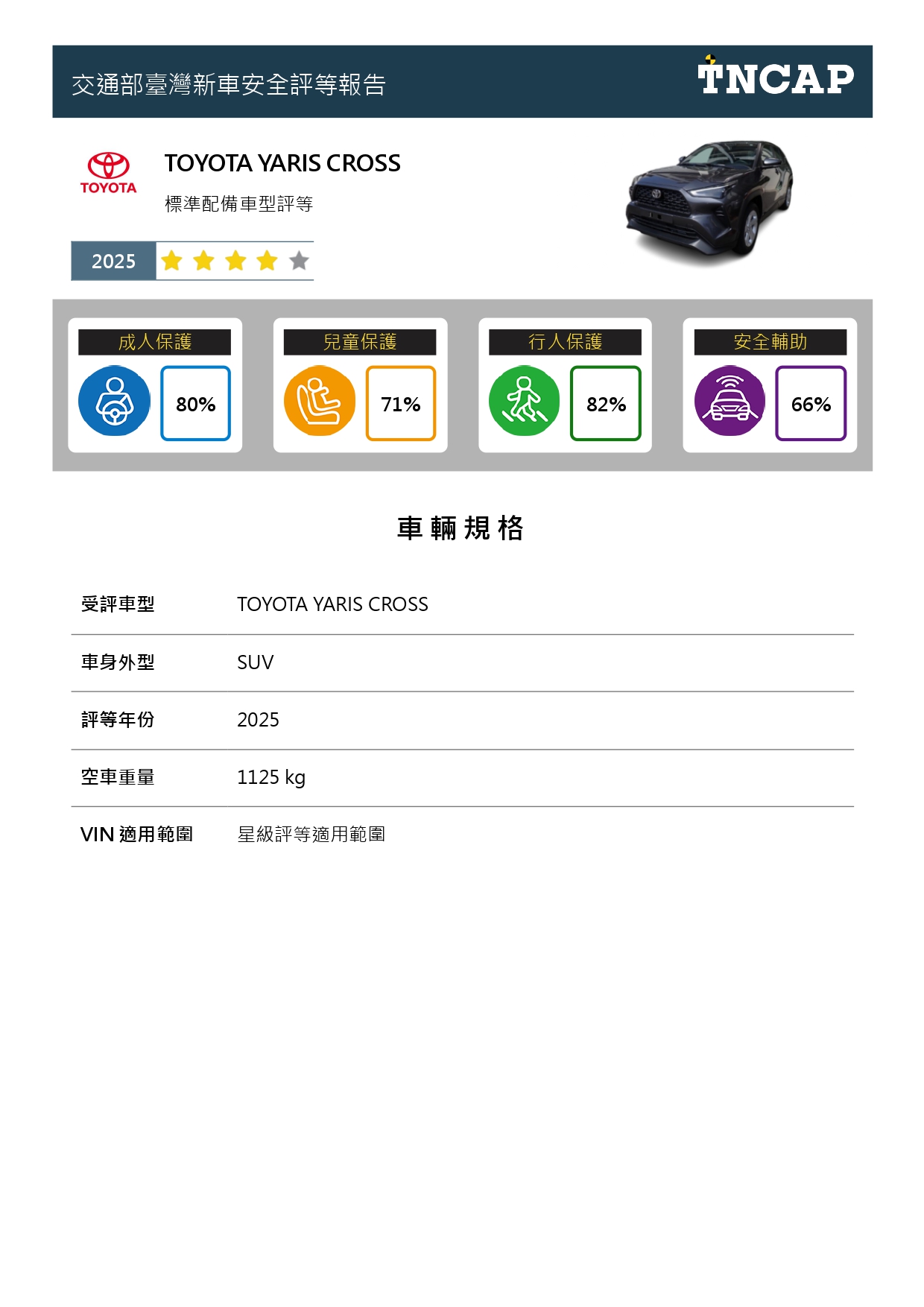 66%,依據星級評等平衡標準規定,YARIS CROSS 車型整體