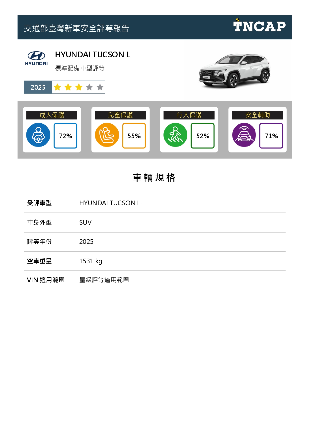 二、 HYUNDAI TUCSON L 於四大安全領域得分率中分別獲得成人保護 72% 、兒童保護 55% 、行人保護 52%及安全輔助 71%,依據星級評等平衡標準規定,TUCSON L 車型整體星級評等