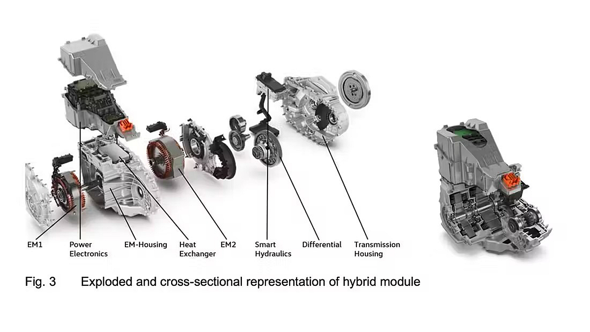 新世代Volkswagen福斯Hybrid複合動力系統的架構有驅動馬達:單純提供動力、發電機:能透過TSI渦輪引擎或動能回收發電、電力系統、差速器、單速變速箱以及具有獨立控制單元的多片離合器,用於耦合和分離TSI渦輪引擎。