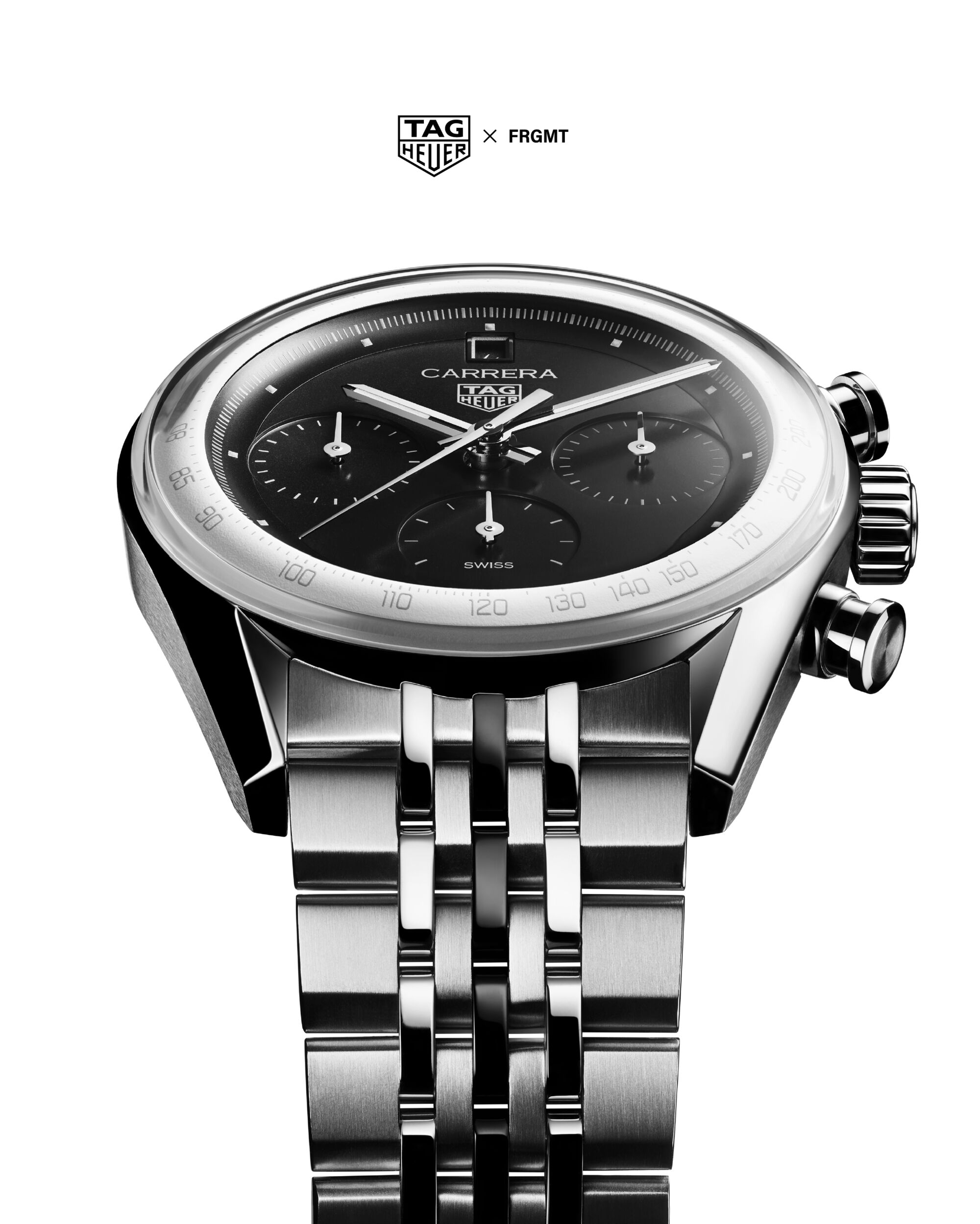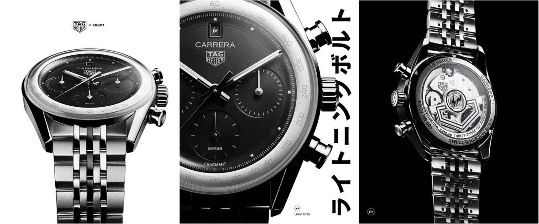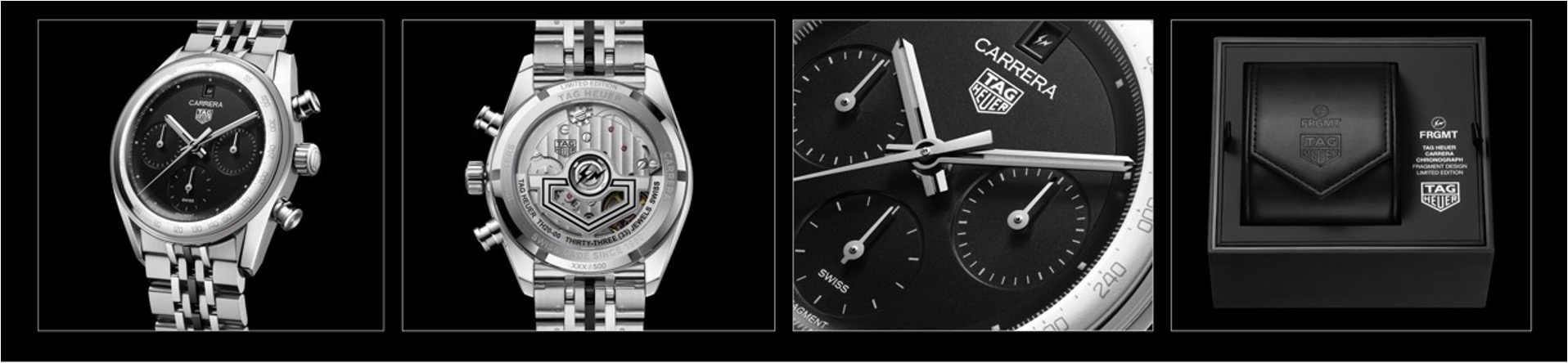 全新 fragment 聯名限量版則將此獨特拱形結構以俐落美學重新演繹,包括標誌性弧形凸緣、對比鮮明的白色外凸緣測速計刻度圈,以及黑中帶黑的錶盤,並搭配特別設計的日期盤:1 與 11 的日期顯示融入 fragment 標誌,巧妙呼應 fragment 的招牌閃電符號。這項創新設計保留 1960 年代的 Carrera 精神,並運用現代材質與比例提升錶盤視覺的清晰度、深度與視覺效果。