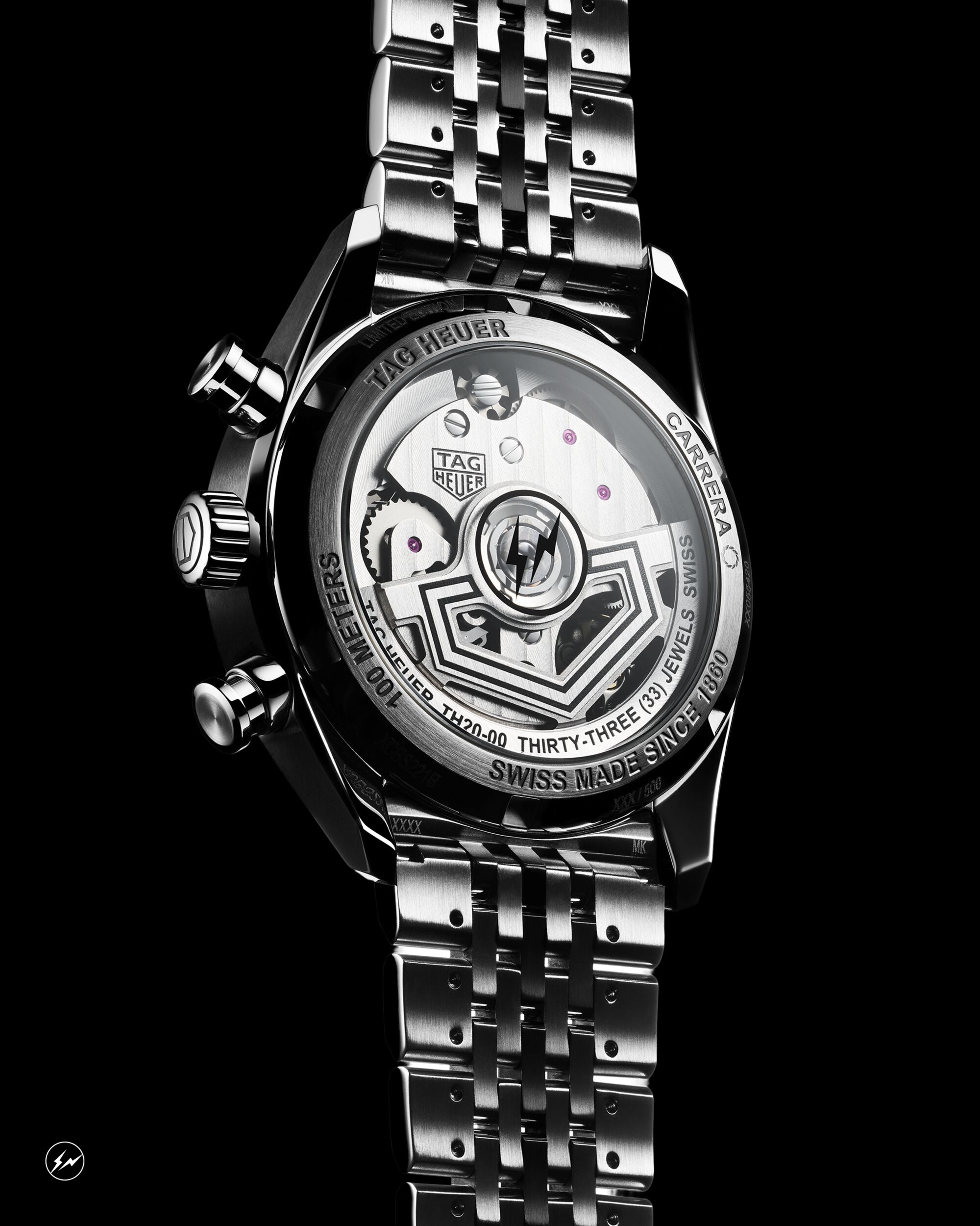 這款腕錶由自製TH20-00機芯負責驅動,此款機芯具備亮眼的80小時動力儲存並享有5年延長保固。其與眾不同之處在於機芯的個性化設計:盾形自動盤以黑色圖像細節呈現,透過藤原浩的視覺語言重新詮釋 TAG Heuer 的經典盾徽。fragment 標誌則直接印製於藍寶石水晶鏡面上,增添獨具識別性的設計細節。