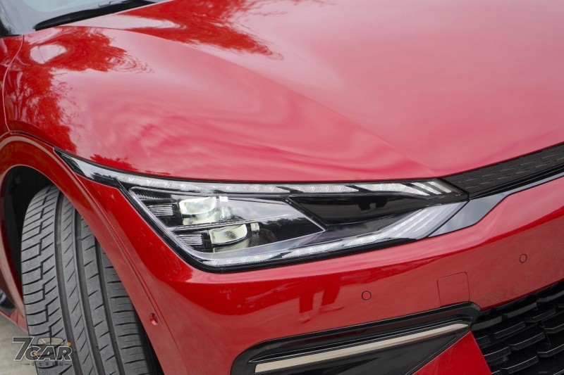 外觀方面,EV6 GT-Line 在車頭部分採用 Kia 家族化的 Digital Tiger Face 設計語彙,搭配造型銳利的 LED 頭燈組,營造未來與科技感,車側則具有類懸浮式車頂風格與隱藏式門把手,車門下方的線條經過後輪拱後直接與拱橋形 LED 尾燈相連,C 柱造型採用傾斜流線的造型,GT-Line 車型足踏 255/45R20 胎圈組。