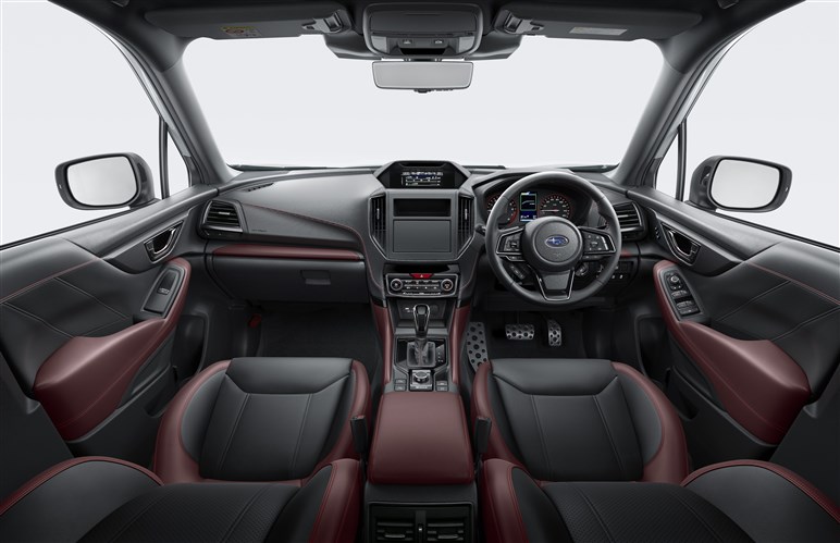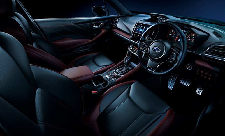 而車室內部則以黑色基調為主,酒紅色元素為輔的設計風格來貫穿整體,並且在儀表台、座椅、中央鞍座、以及門板等處都加入了品牌波爾多紅色皮革的包覆。除此之外,車內多處的紅色縫線以及專屬的 STI 字樣也都有著經典 STI 的象徵韻味。