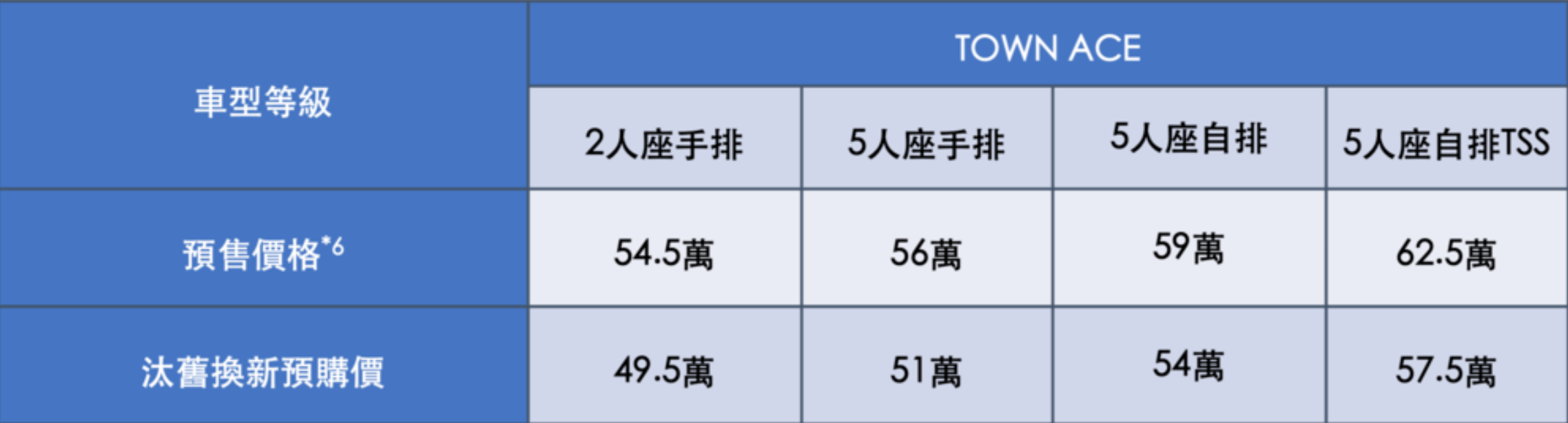 本次等級編成,TOWN ACE廂型車提供2人座手排、5人座手排、5人座自排、5人座自排TSS等四種車型等級以滿足不同需求。車色選擇上,提供雪貂白、極光銀等兩種外觀車色;正式上市前將以汰舊換新預購價49.5萬元*1起接受客戶預先下訂(多退少不補)。自10月27日起,TOWN ACE廂型車將於全台TOYOTA經銷商指定據點展開巡迴展示,喜愛TOWN ACE廂型車的消費者,可直接洽詢全台TOYOTA經銷商據點,詢問賞車訂車事宜。相關資訊亦可上TOYOTA 網站:https://www.toyota.com.tw/event/202210_townacevan_preorder/查詢。