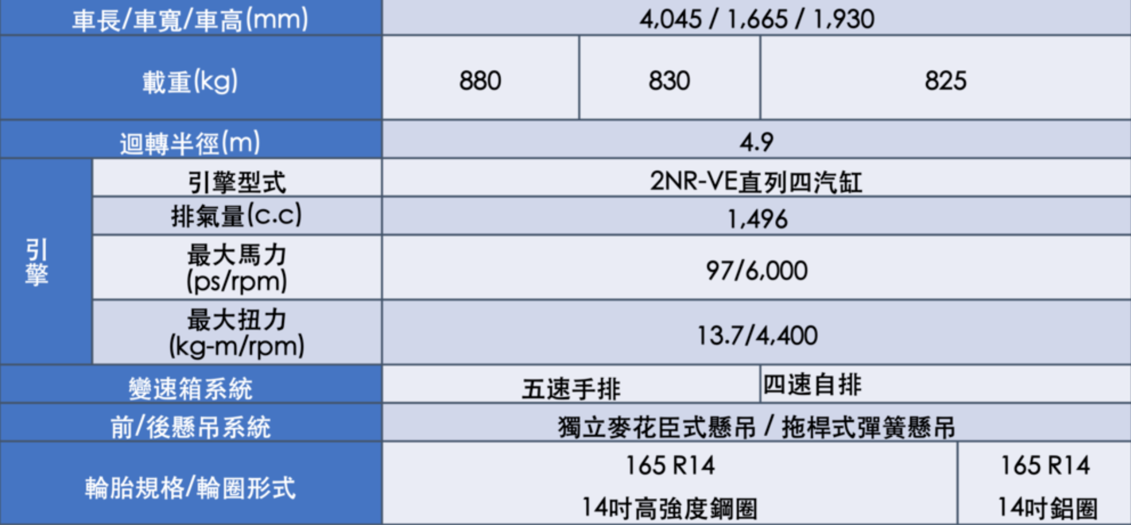 註2:最高載重量880公斤係指2人座手排等級,由國瑞汽車股份有限公司測試取得,數值為標準值,未含容許公差。