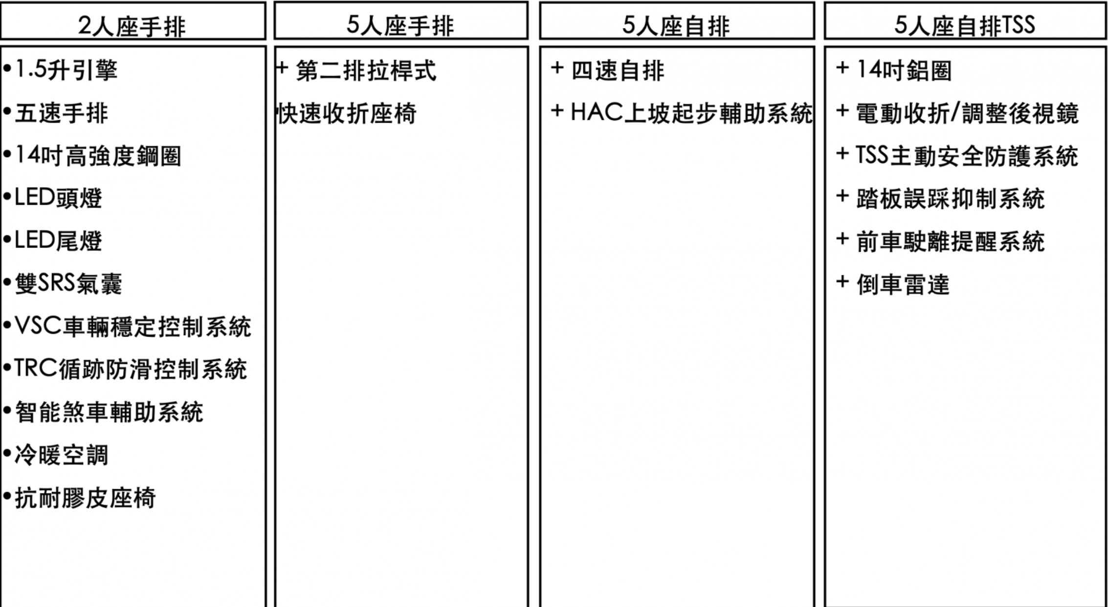 註3:最高載重量830公斤係指5人座手排等級,由國瑞汽車股份有限公司測試取得,數值為標準值,未含容許公差。
