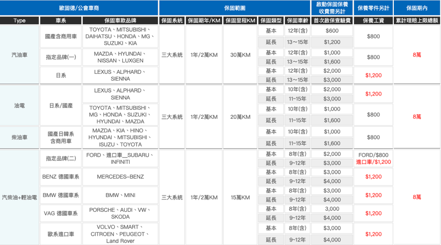 保固費用依照車齡、里程數、車況而有所不同,如圖: