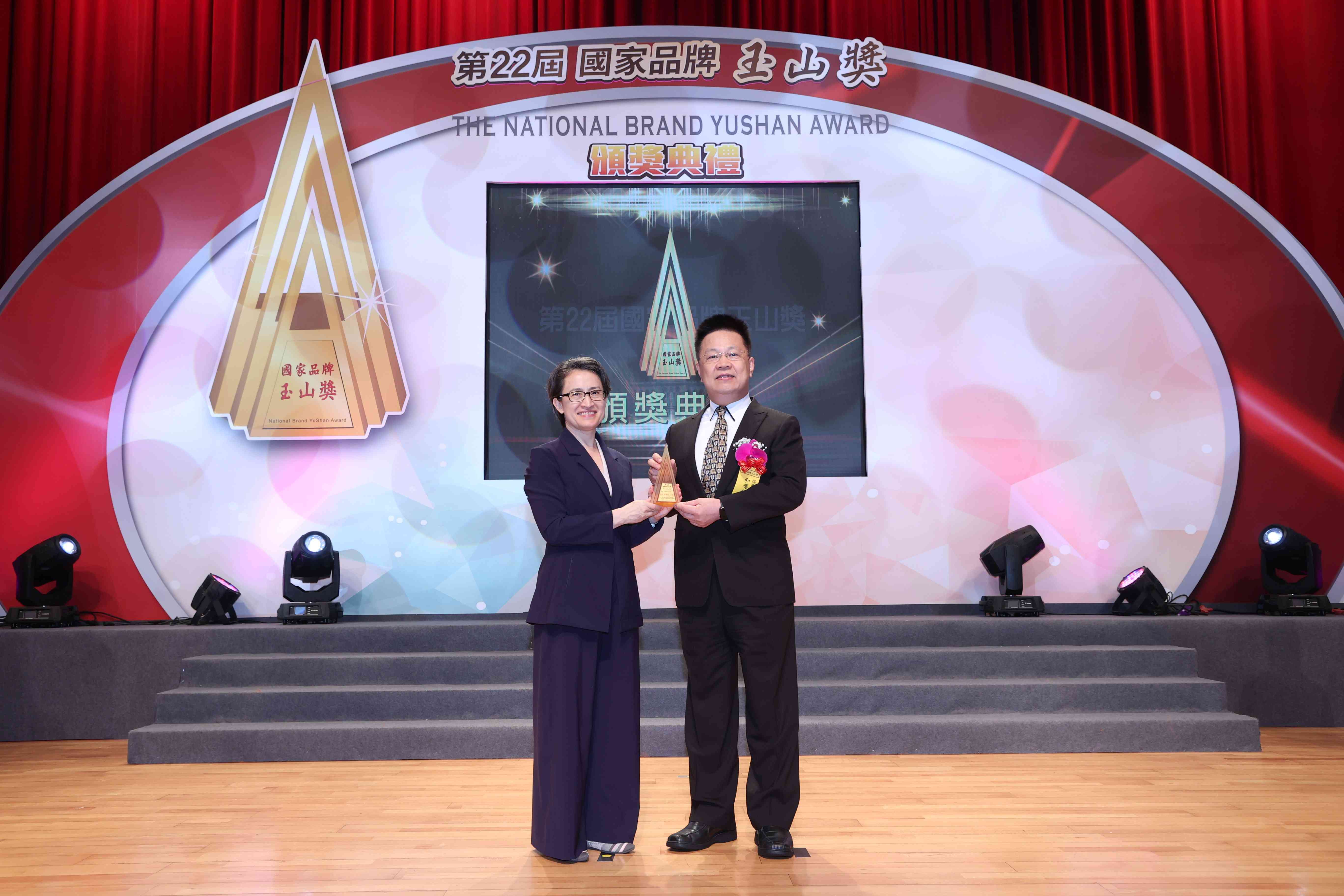 第22屆國家品牌玉山獎頒獎典禮於10月21日舉行,由副總統蕭美琴(左)頒發傑出企業獎項,和運租車總經理謝富來(右)出席代表受獎。