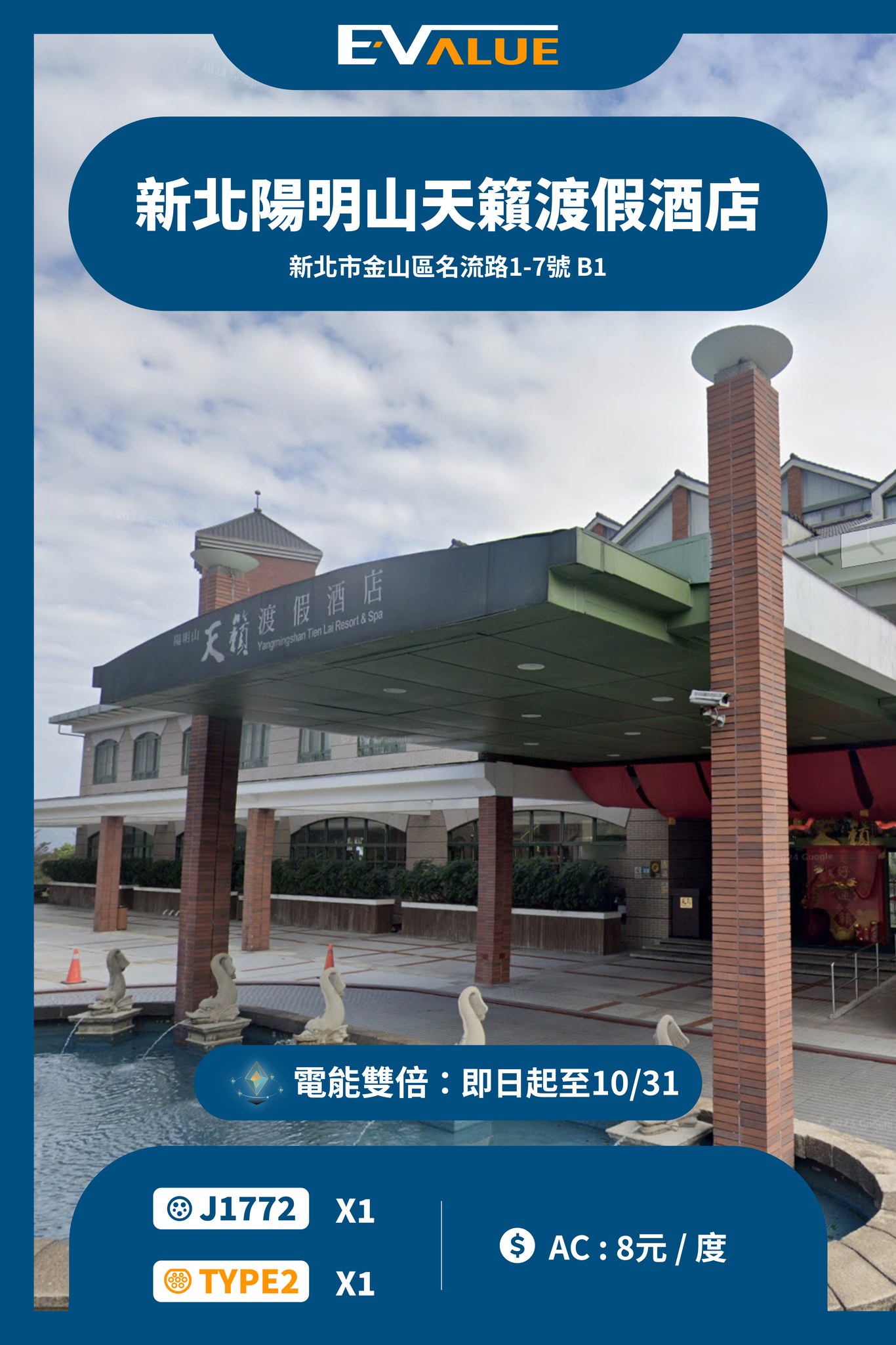 開電動車上陽明山泡湯更方便了!新北陽明山天籟渡假酒店宣布正式啟用EVALUE電動車充電站,讓旅客在度假休閒之餘,也能輕鬆幫愛車補電。
