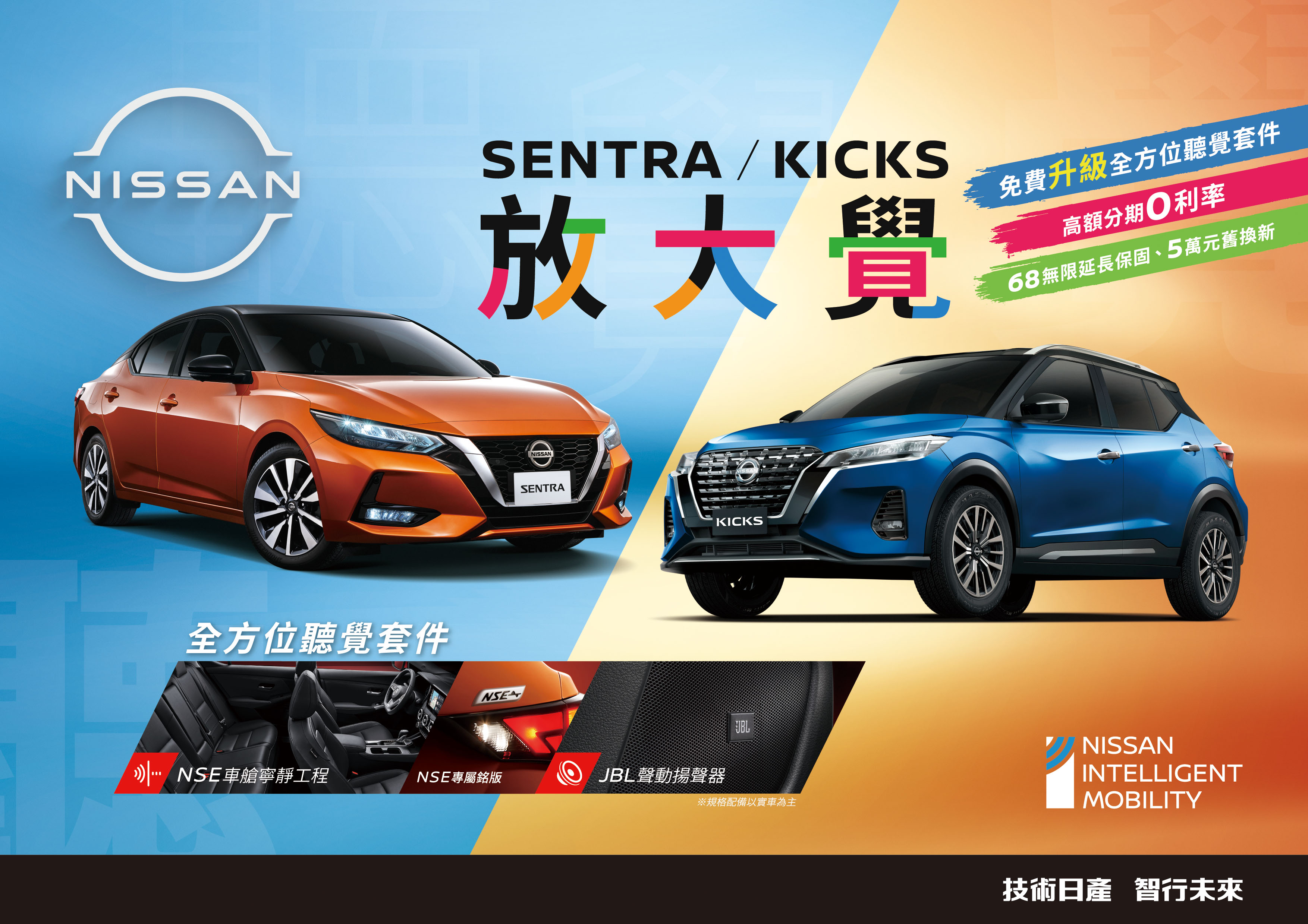 NISSAN限時推出「SENTRA / KICKS放大覺」購車優惠專案,自2023年2月1日起至2月24日止,入主ALL NEW SENTRA、KICKS即可免費升級NISSAN精選「全方位聽覺套件組」乙套,包含廣受眾多車主好評的「JBL聲動揚聲器」,提供多層次音感享受,以及「NSE車艙寧靜工程」,打造車室空間音場更升級,雙管齊下放大聽覺感受,在行駛途中享受車室高質感音響升級的愉悅;再享超值優惠,包含高額分期零利率、舊換新5萬元優先領以及68無限里程延長保固等多重優惠,讓NISSAN車主在嶄新一年輕鬆入主新車,放大聽覺,升級享受。
