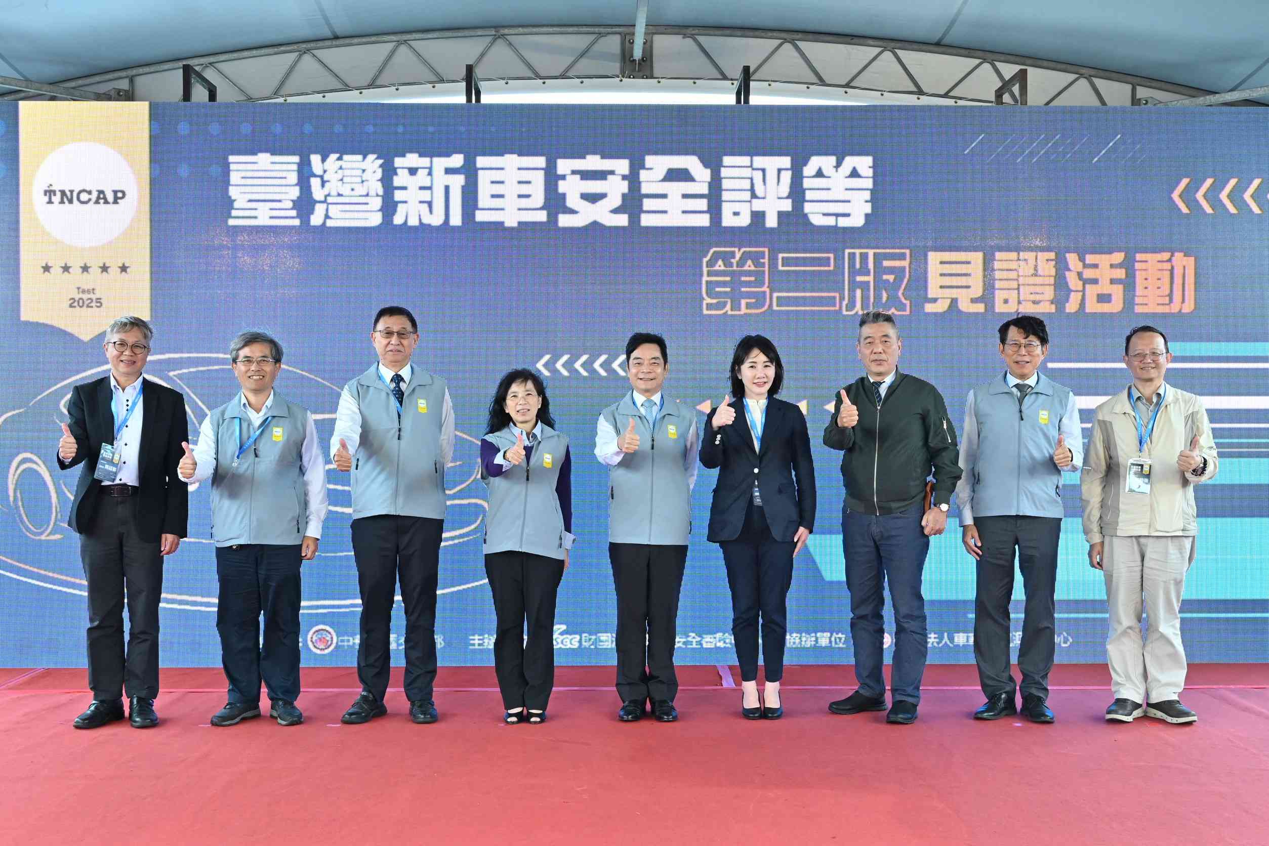 為提升國內車輛安全性並降低交通事故傷亡率,交通部積極推動「臺灣新車安全評等計畫(簡稱TNCAP)」,今(114)年10月28日於財團法人車輛研究測試中心舉辦「臺灣新車安全評等第二版見證活動」,由指導單位-交通部伍勝園政務次長主持,並邀請立法院謝衣鳯委員、國防戰略與資源研究所蘇紫雲所長、車輛中心王正健董事長上台致詞,期勉TNCAP制度持續推動並提供民眾更多元的購車資訊;本次活動亦廣邀產、官、學、研及媒體代表共同參與見證,展現交通部積極推動TNCAP制度的成果,活動在熱烈掌聲中圓滿成功。