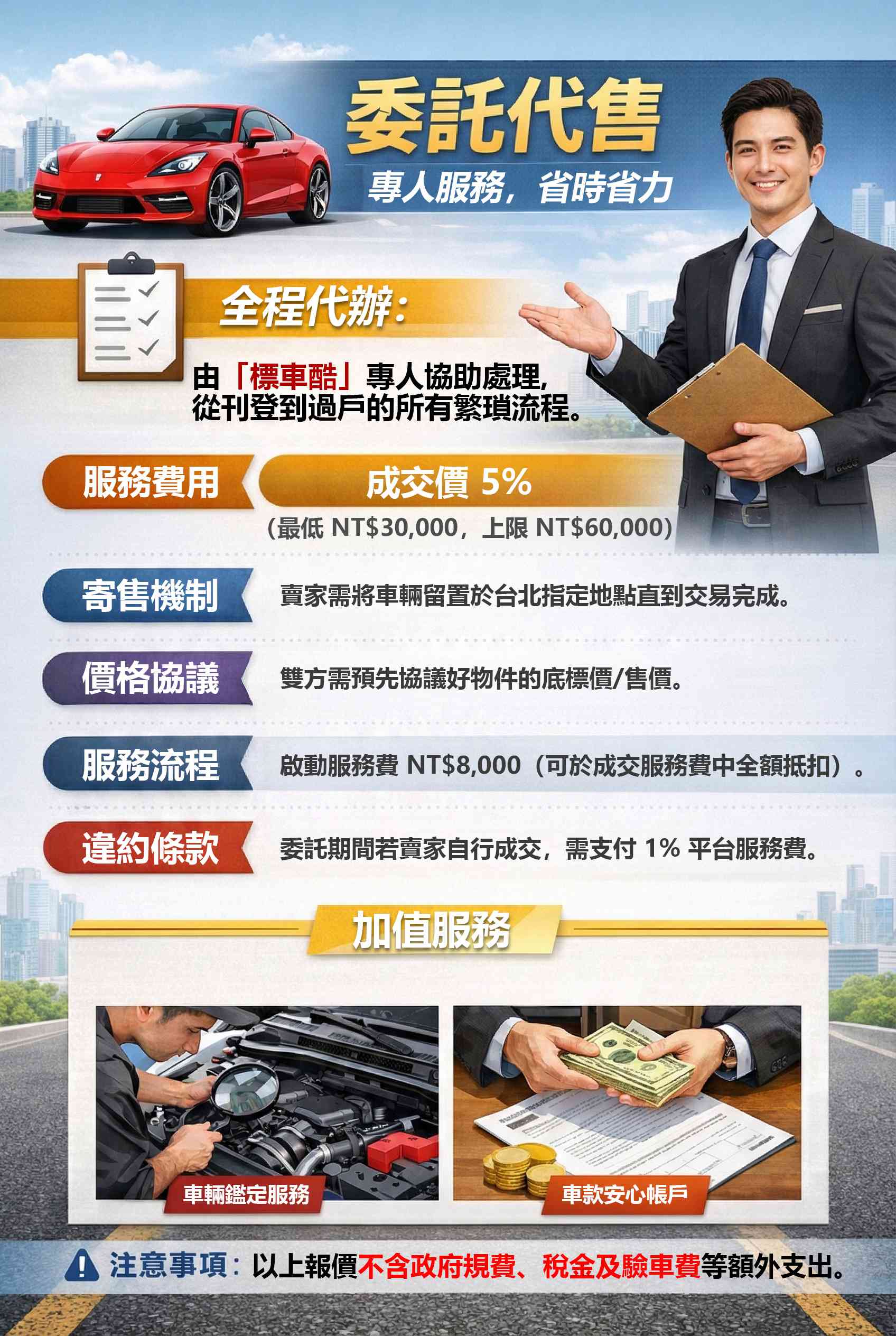 • 全程代辦: 由「標車酷」專人協助處理從刊登到過戶的所有繁瑣流程。