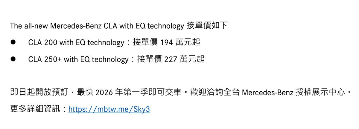 Mercedes-Benz台灣賓士突發預售全新第三代CLA電動車,提供CLA 200 with EQ technology、接單價新台幣194萬元起以及CLA 250+ with EQ technology、接單價新台幣227萬元起兩種車型可選,其中CLA 200 with EQ technology更是獨步全球首發。