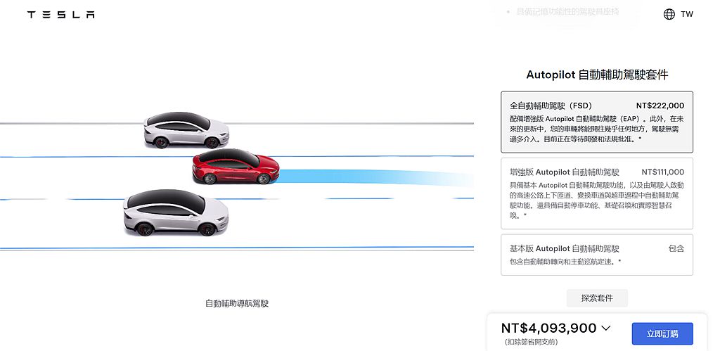 選配套件方面,包含導航、電動摺疊後視鏡、網路廣播、盲點預警、具備記憶功能性的舒適性套件,改款Model S、Model X選配價都是新台幣384,000元;FSD全自動輔助駕駛系統為新台幣222,000元。