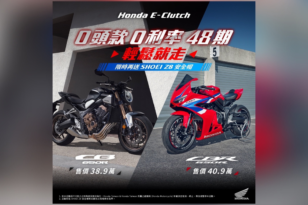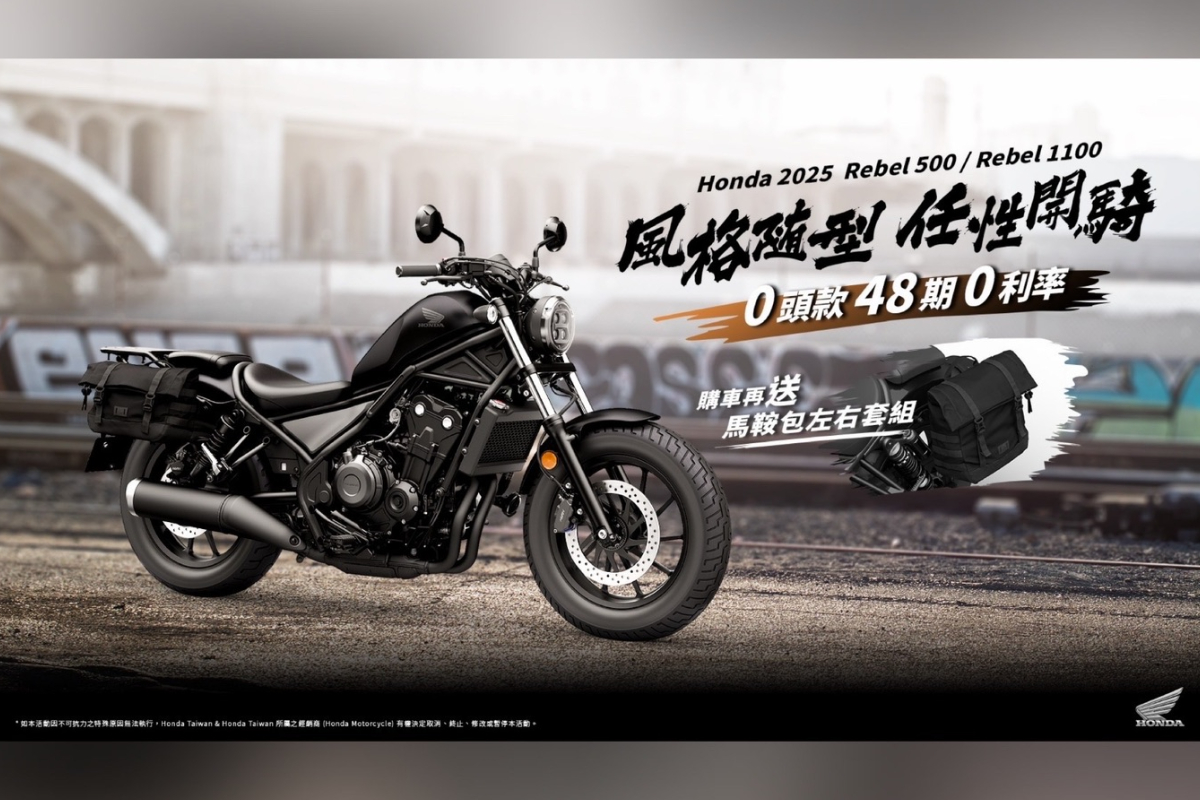 本月特別推出 「風格隨行 任性開騎」專案,Rebel車系低座高與流暢的動力輸出,深受展現自我個性的車主喜愛,11月訂購Rebel500、Rebel 1100,即贈送原廠左右馬鞍包套組,兼顧造型與實用性,讓旅途收納更輕鬆,完美融合率性風格與裝載便利性。搭載科技新潮流的CB650R E-Clutch以及CBR650R E-Clutch,以簡易、直覺的操作體驗,獲得市場熱烈迴響,享48期0頭款 0利率優惠,限時再送Shoei Z-8安全帽,讓騎士在享受騎乘樂趣的同時,也能兼顧行車安全與時尚風格。同時針對多款人氣機種提供超值的「通通零利率 追風零阻力」專案,全車系指定車款最高享72期、0頭款、0利率,不論是日常通勤、假日出遊或冒險壯遊,都能無壓力且無負擔入主Honda人氣二輪機種,享受專屬於騎士的馳騁自由。