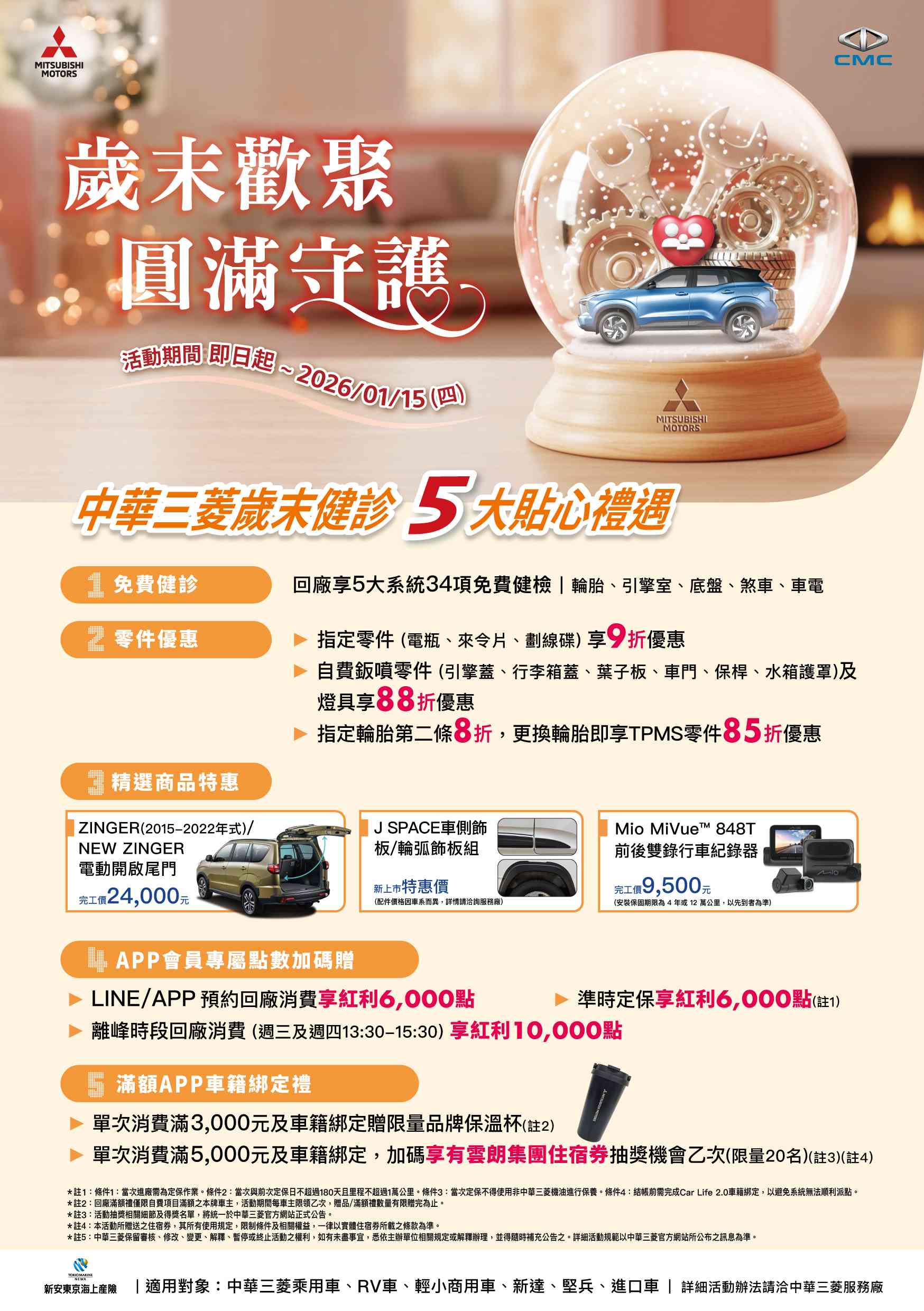 冬季是車輛保養的關鍵期,中華三菱特別規劃包含輪胎、引擎室、底盤、煞車及車電系統等5大系統,共計34項免費檢查,確保愛車維持最佳狀態。針對維修需求,活動期間指定零件如電瓶、來令片、劃線碟享9折優惠;更換指定輪胎第二條享8折,並加碼TPMS零件85折優惠,讓車主以最實惠的價格完成愛車整備。