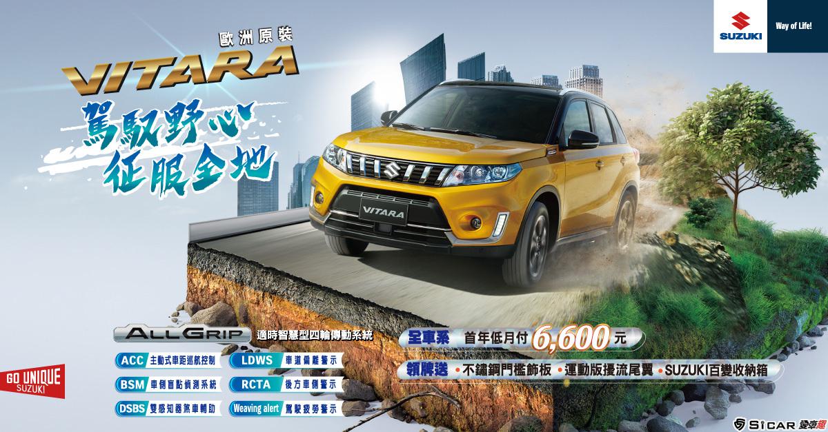 SUZUKI限時推出VITARA全車系首年低月付,只要6,600元的全能優惠,VITARA領牌再送不鏽鋼門檻飾板、運動版擾流尾翼以及SUZUKI百變收納箱,想擁有全能實力休旅,正是時候。