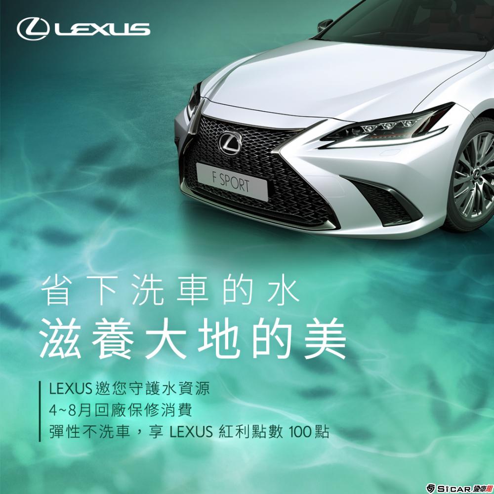 為響應節水政策,於2021年4月至8月,LEXUS提供彈性選擇不洗車回饋100點紅利點數的活動。針對回廠保養、維修消費之LEXUS車主,我們提供100點紅利點數回饋,鼓勵車主選擇不洗車服務,與大家一起共體時艱、響應節水措施。