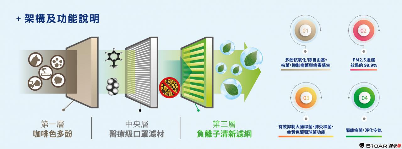 - 三層過濾(濾網結構):第一層(迎風面)/第二層(中央層)-皆能有效預防車內清潔車內空氣、5過濾、消除自由基。第三層(背風面)-清淨車內空氣。